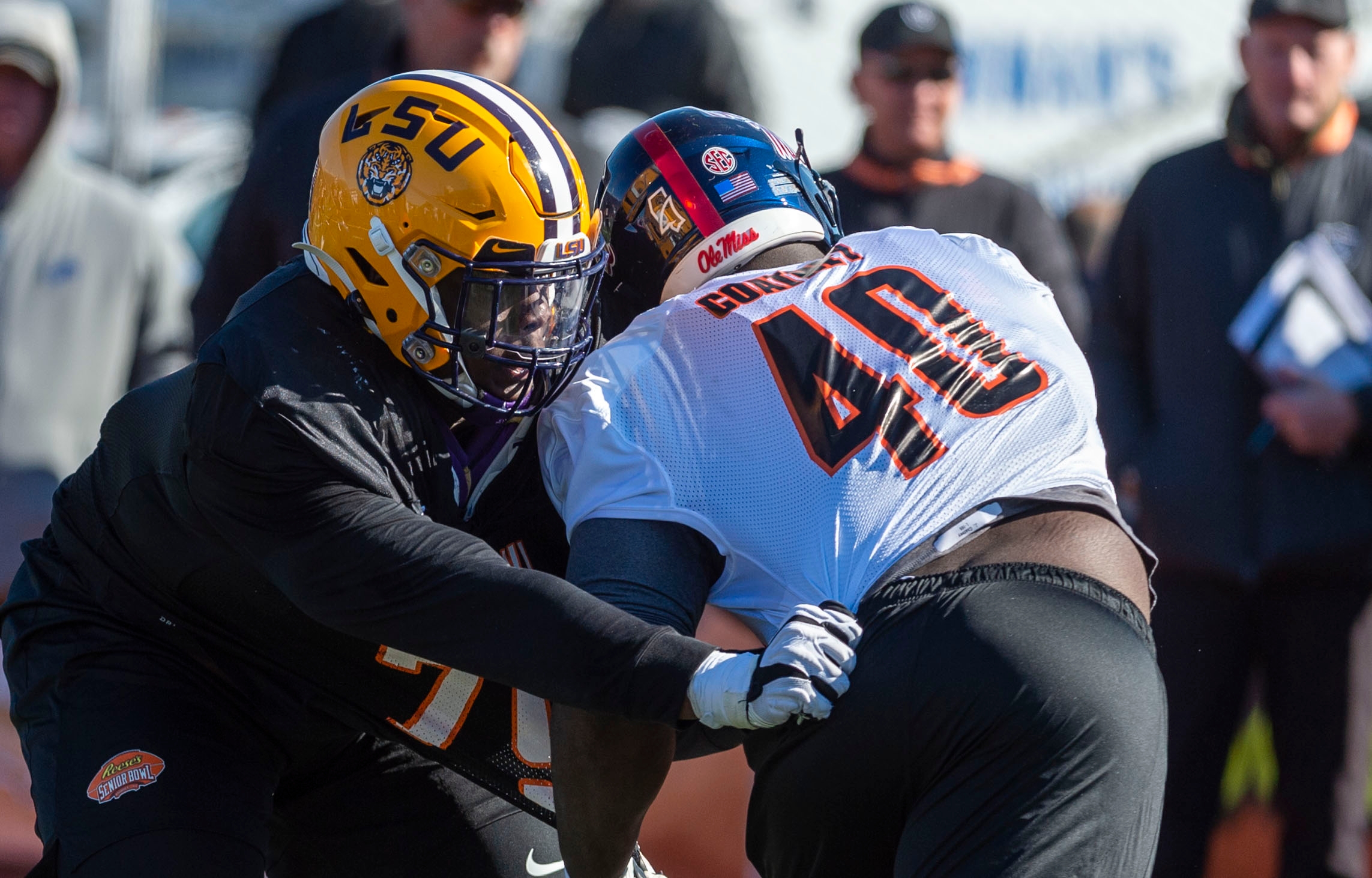 Jan 21, 2020; Mobile, AL, USA; South offensive lineman Lloyd Cushenberry III of LSU (79) spars with South defensive tackle Josiah Coatney of Ole Miss (40) during Senior Bowl practice. Mandatory Credit: Vasha Hunt-USA TODAY Sports / Vasha Hunt