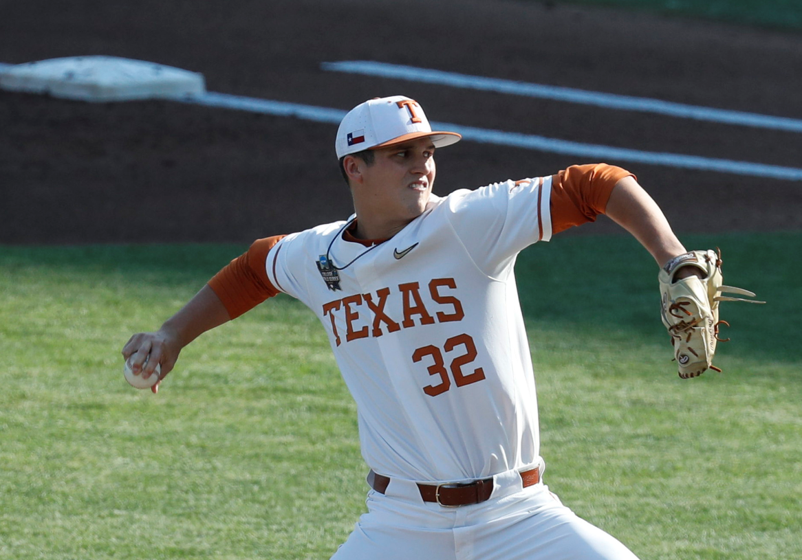 Jun 20, 2021; Omaha, Nebraska, USA; Texas Longhorns pitcher Ty Madden (32) throws against the Mississippi State Bulldogs at TD Ameritrade Park. Mandatory Credit: Bruce Thorson-USA TODAY Sports / Bruce Thorson-USA TODAY Sports