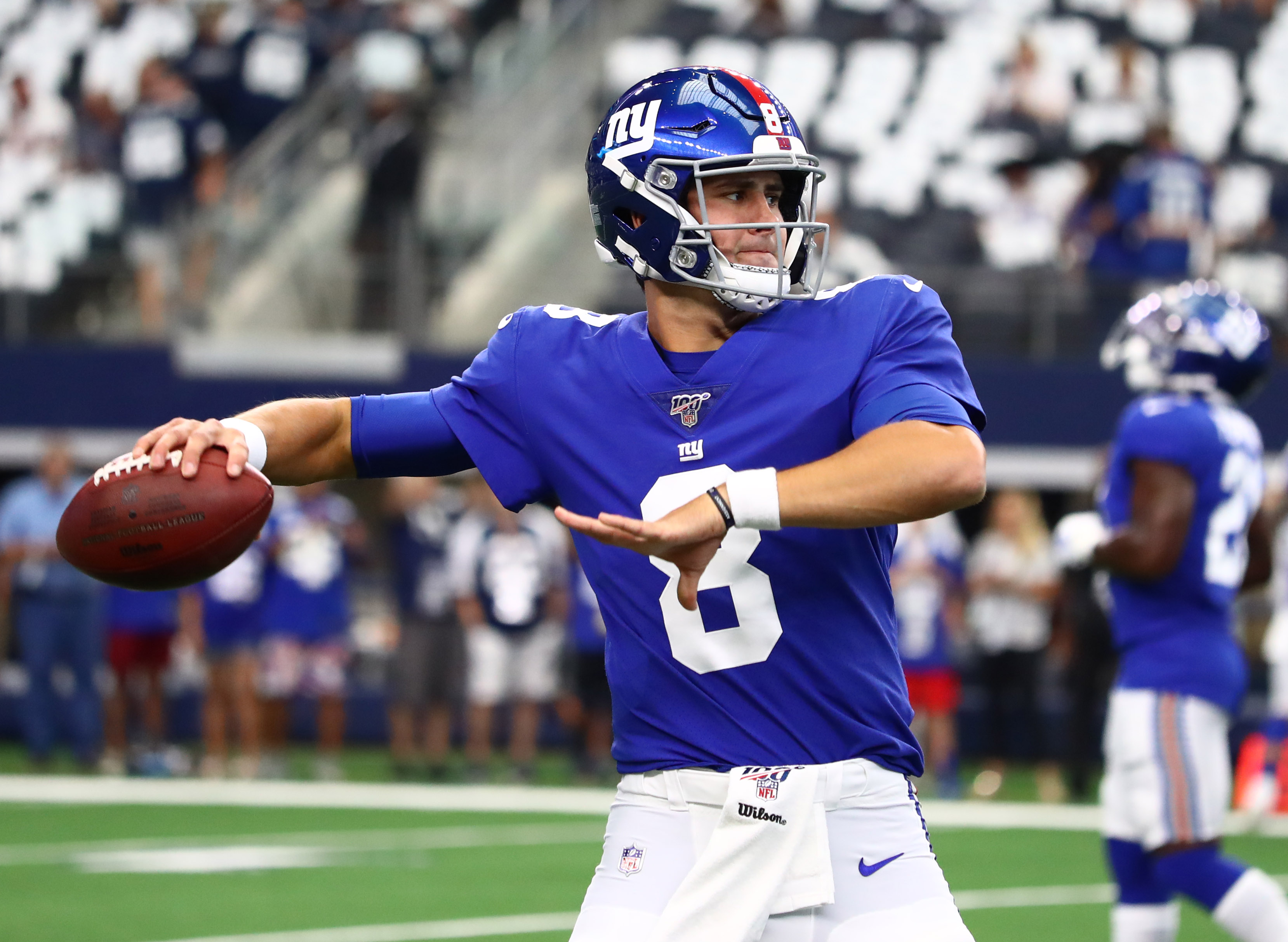 Sep 8, 2019; Arlington, TX, USA; New York Giants quarterback Daniel Jones (8) throws prior to the game against the Dallas Cowboys at AT&T Stadium. Mandatory Credit: Matthew Emmons-USA TODAY Sportsundefined