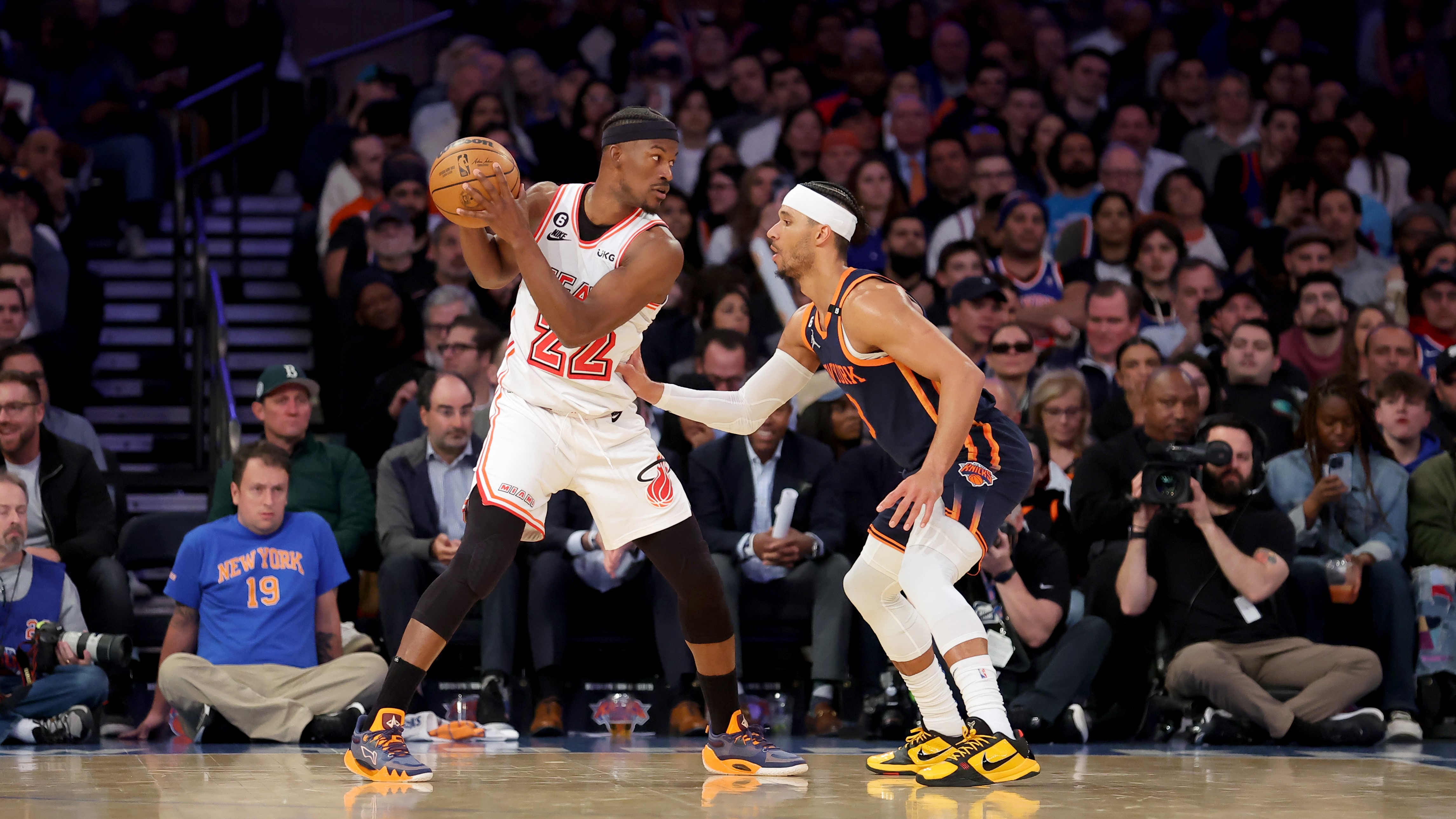3 things to watch as Knicks face Heat in 2023 NBA playoffsNew York won 3 of 4 against Miami in 2022-23 season4/30/2023, 3:30 PMIan BegleyNBA InsiderApr 15, 2023; Cleveland, Ohio, USA; New York Knicks center Mitchell Robinson (23) dunks against the Cleveland Cavaliers in the first quarter of game one of the 2023 NBA playoffs at Rocket Mortgage FieldHouse. Mandatory Credit: David Richard-USA TODAY Sports / © David Richard-USA TODAY SportsMar 29, 2023; New York, New York, USA; Miami Heat forward Jimmy Butler (22) controls the ball against New York Knicks guard Josh Hart (3) during the fourth quarter at Madison Square Garden. Mandatory Credit: Brad Penner-USA TODAY Sports / © Brad Penner-USA TODAY SportsMar 22, 2023; Miami, Florida, USA; New York Knicks forward Julius Randle (30) protects the basketball from Miami Heat forward Caleb Martin (16) during the first quarter at Miami-Dade Arena. Mandatory Credit: Sam Navarro-USA TODAY Sports / © Sam Navarro-USA TODAY Sports