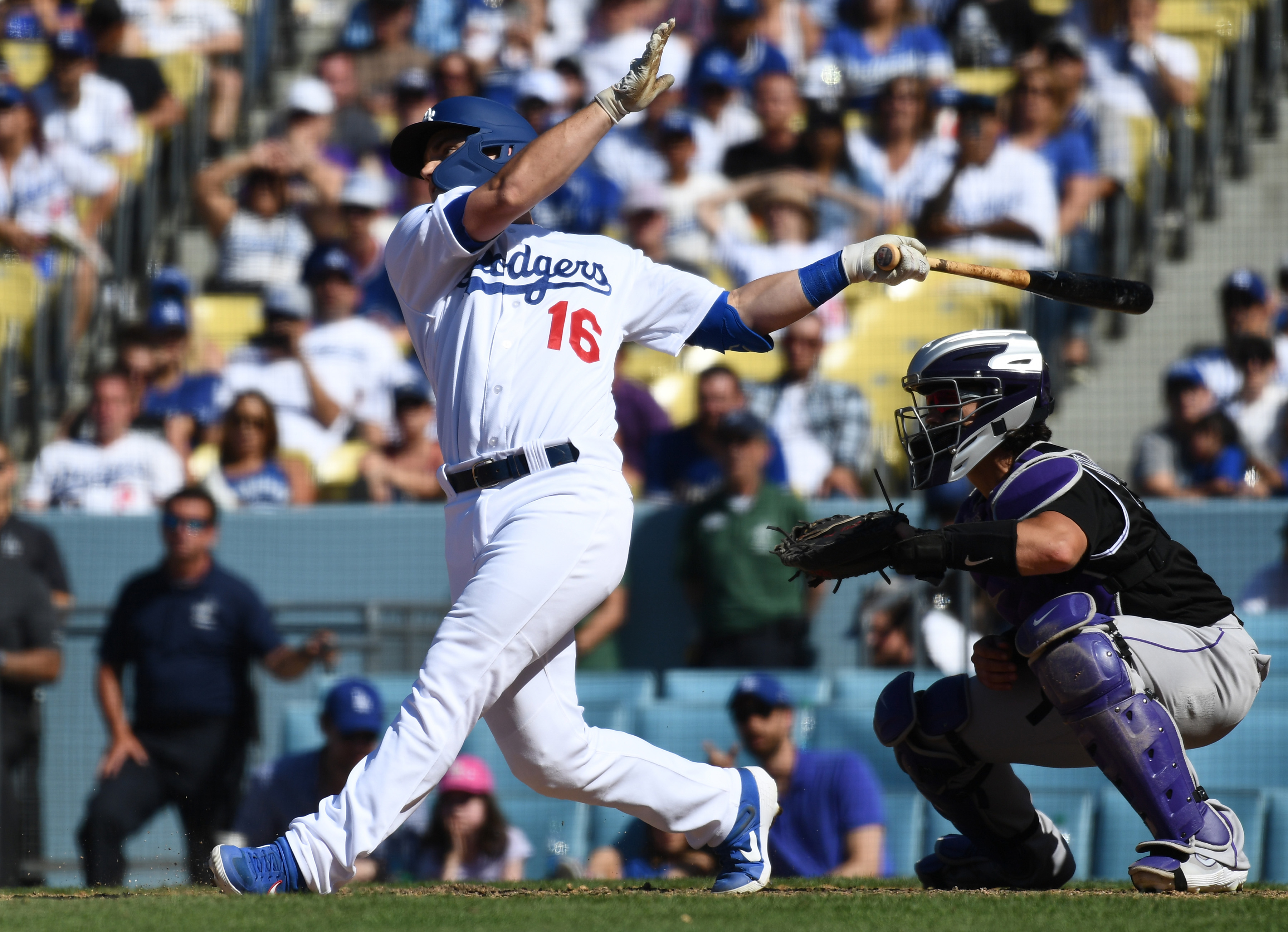 Jun 23, 2019; Los Angeles, CA, USA; Los Angeles Dodgers pitch hitter Will Smith (16) hits a three-run home run in the bottom of the ninth inning to beat the Colorado Rockies 6-3 at Dodger Stadium. Mandatory Credit: Robert Hanashiro-USA TODAY Sports / Robert Hanashiro