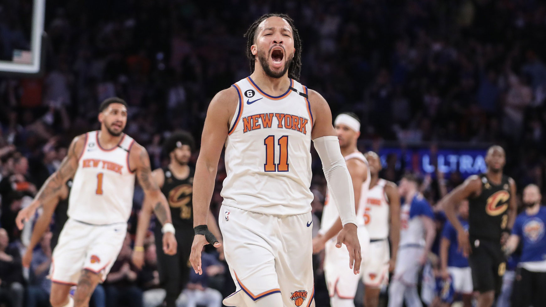 Apr 21, 2023; New York, New York, USA; New York Knicks guard RJ Barrett (9) drives to the basket against Cleveland Cavaliers center Jarrett Allen (31) and guards Darius Garland (10) and Caris LeVert (3) during the fourth quarter of game three of the 2023 NBA playoffs at Madison Square Garden. / Brad Penner-USA TODAY Sports