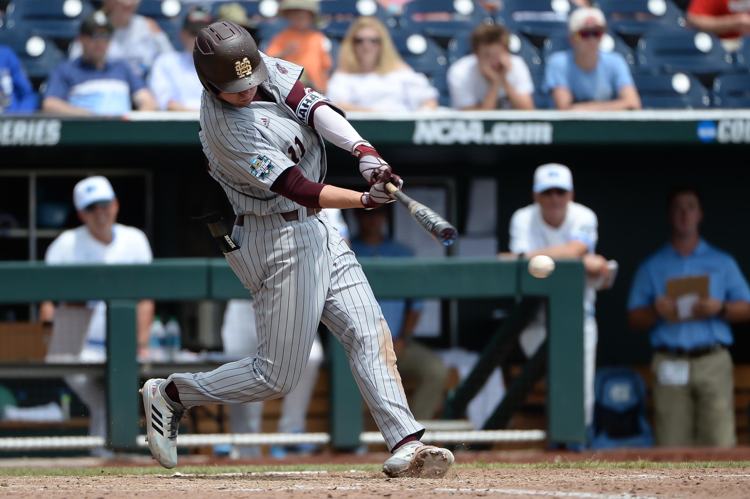 Jun 19, 2018; Omaha, NE, USA; Mississippi State Bulldogs designated hitter Jordan Westburg (11) drives in three runs with a double in the eighth inning against the North Carolina Tar Heels in the College World Series at TD Ameritrade Park. Mandatory Credit: Steven Branscombe-USA TODAY Sports / Steven Branscombe