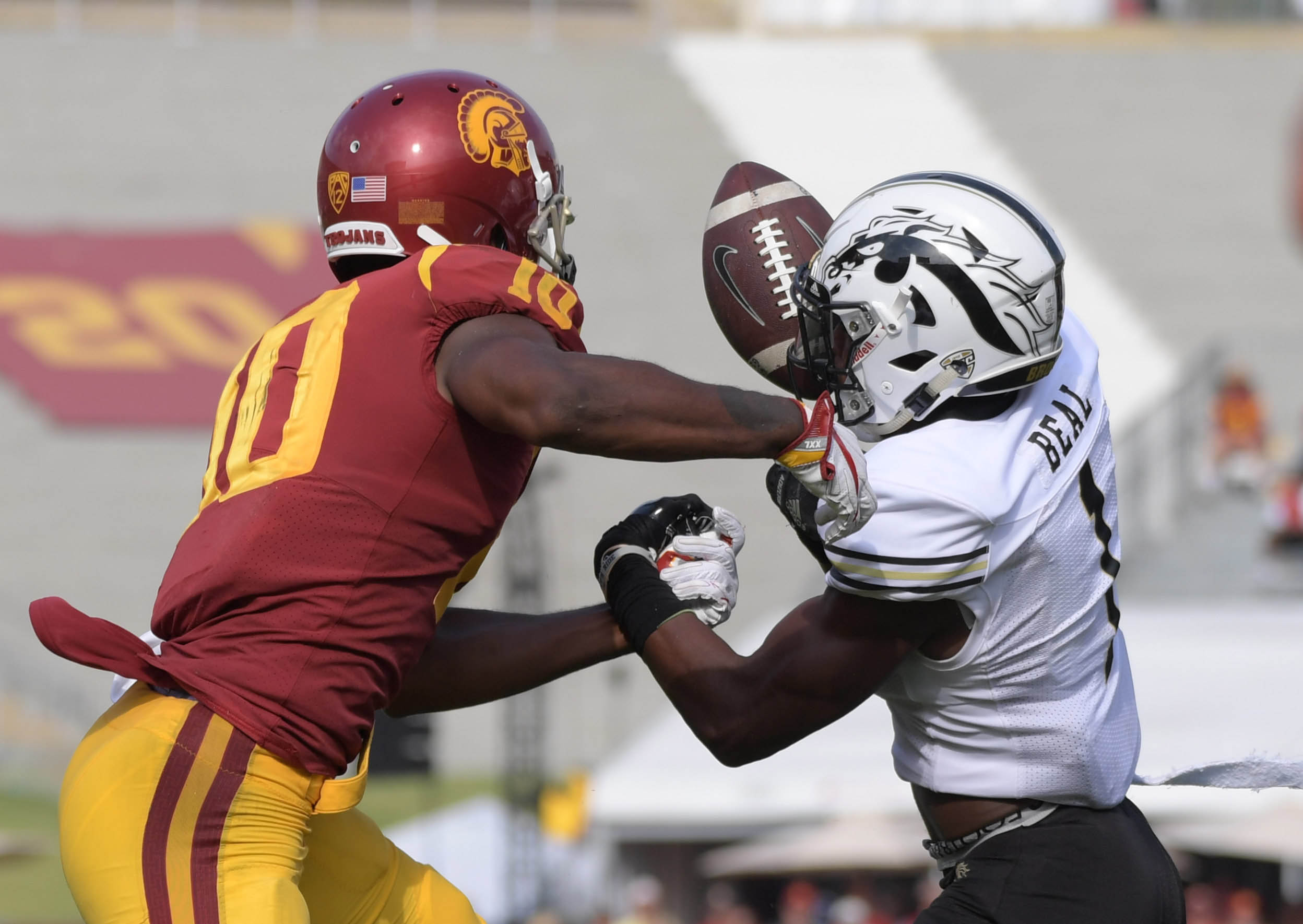 Sep 2, 2017; Los Angeles, CA, USA; Western Michigan Broncos defensive back Sam Beal (1) intercepts a pass intended for Southern California Trojans wide receiver Jalen Greene (10) during a NCAA football game at Los Angeles Memorial Coliseum. USC defeated Western Michigan 49-31. Mandatory Credit: Kirby Lee-USA TODAY Sports / Kirby Lee