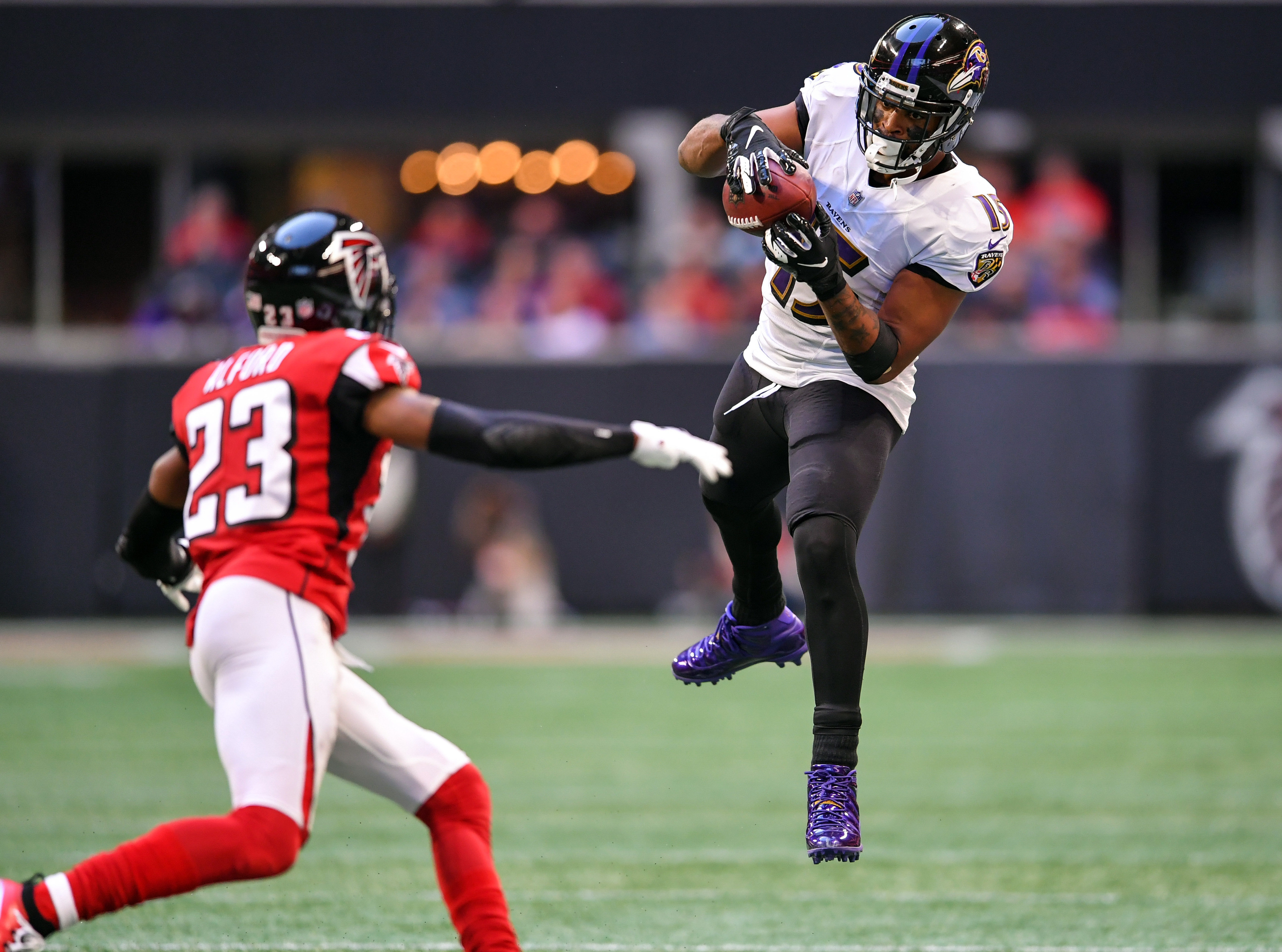 Dec 2, 2018; Atlanta, GA, USA; Baltimore Ravens wide receiver Michael Crabtree (15) makes a catch in front of Atlanta Falcons cornerback Robert Alford (23) during the second half at Mercedes-Benz Stadium. Mandatory Credit: Dale Zanine-USA TODAY Sports / Dale Zanine