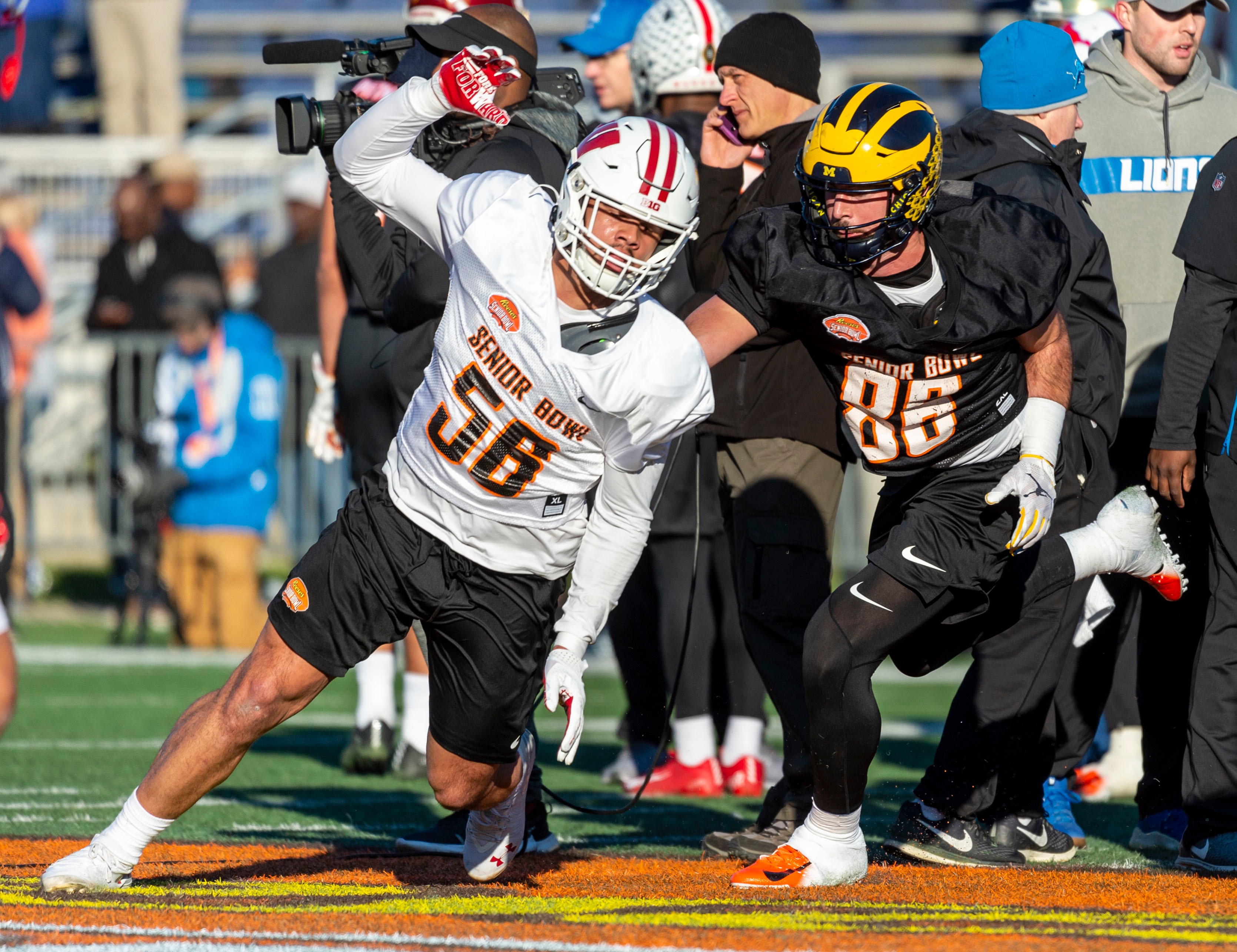 Jan 21, 2020; Mobile, Alabama, USA; North outside linebacker Zack Baun of Wisconsin (56) works around North tight end Sean McKeon of Michigan (86) during Senior Bowl practice at Ladd-Peebles Stadium. Mandatory Credit: Vasha Hunt-USA TODAY Sports / Vasha Hunt