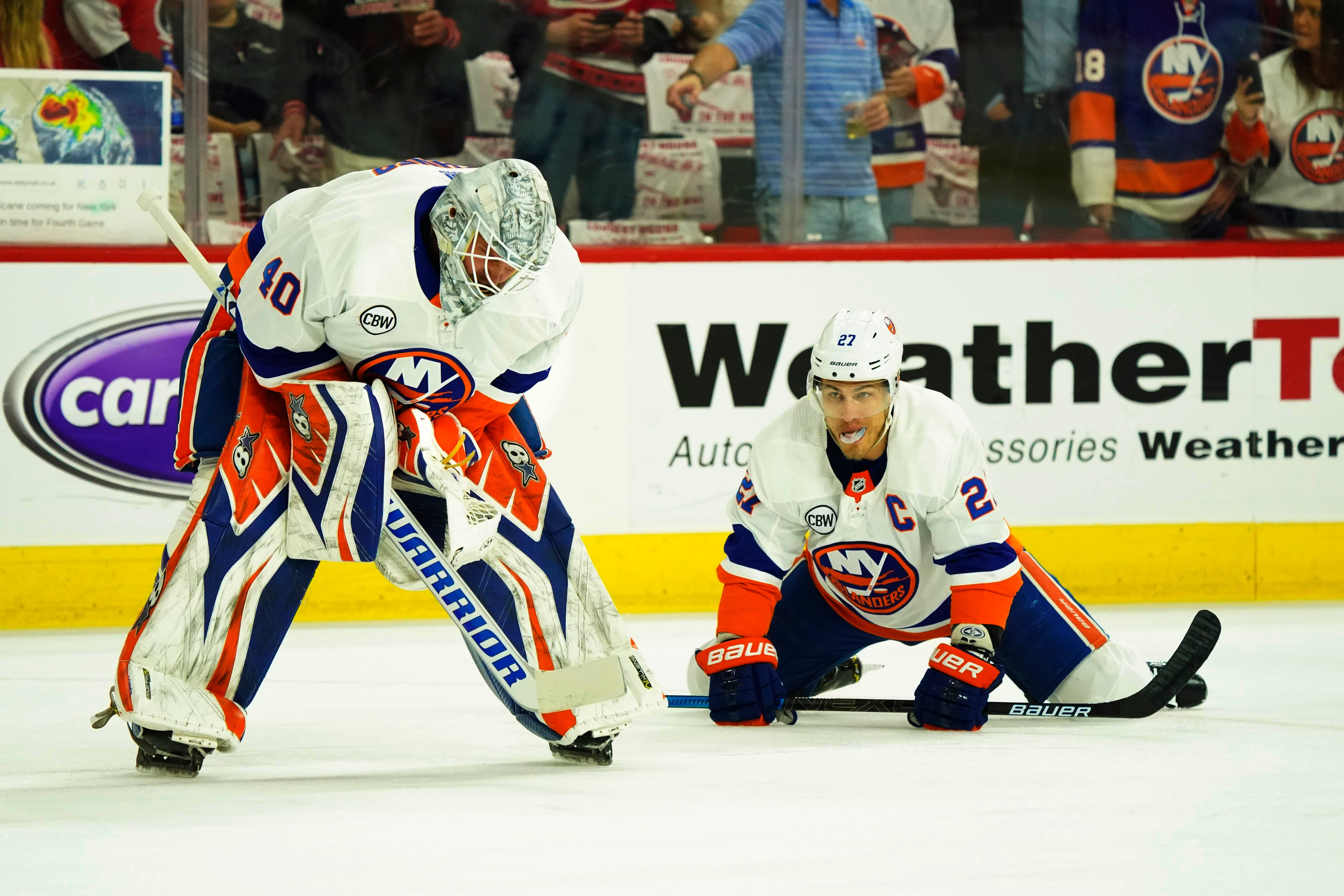 May 3, 2019; Raleigh, NC, USA; New York Islanders goaltender Robin Lehner (40) and left wing Anders Lee (27) looks on during warmups before the game against the Carolina Hurricanes in game four of the second round of the 2019 Stanley Cup Playoffs at PNC Arena. The Carolina Hurricanes defeated the New York Islanders 5-2. Mandatory Credit: James Guillory-USA TODAY Sports / James Guillory