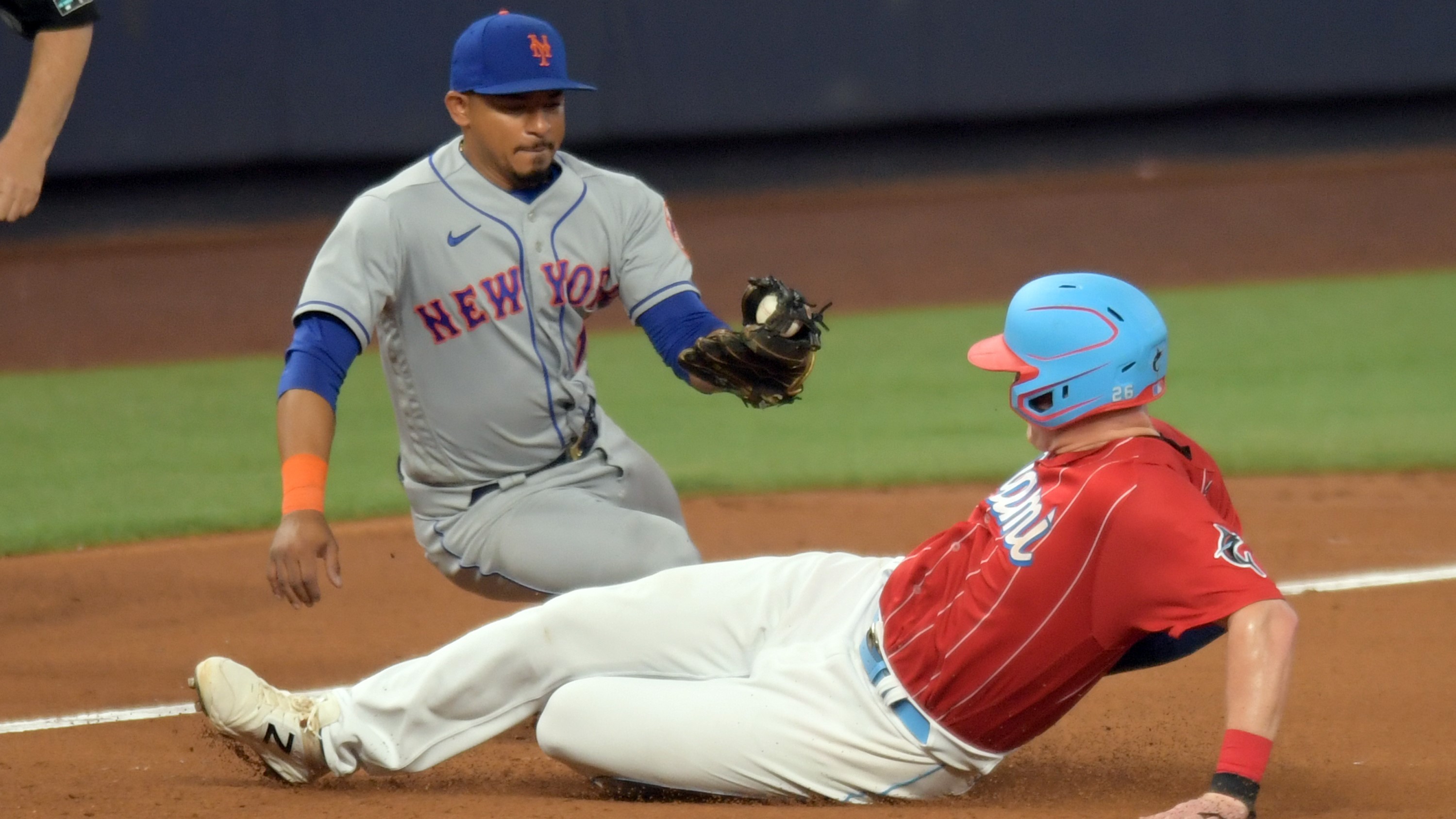 Miami Marlins right fielder Garrett Cooper (26) gets tagged out at third base by New York Mets third baseman Eduardo Escobar (10) in the fourth inning at loanDepot Park. / Jim Rassol - USA TODAY Sports