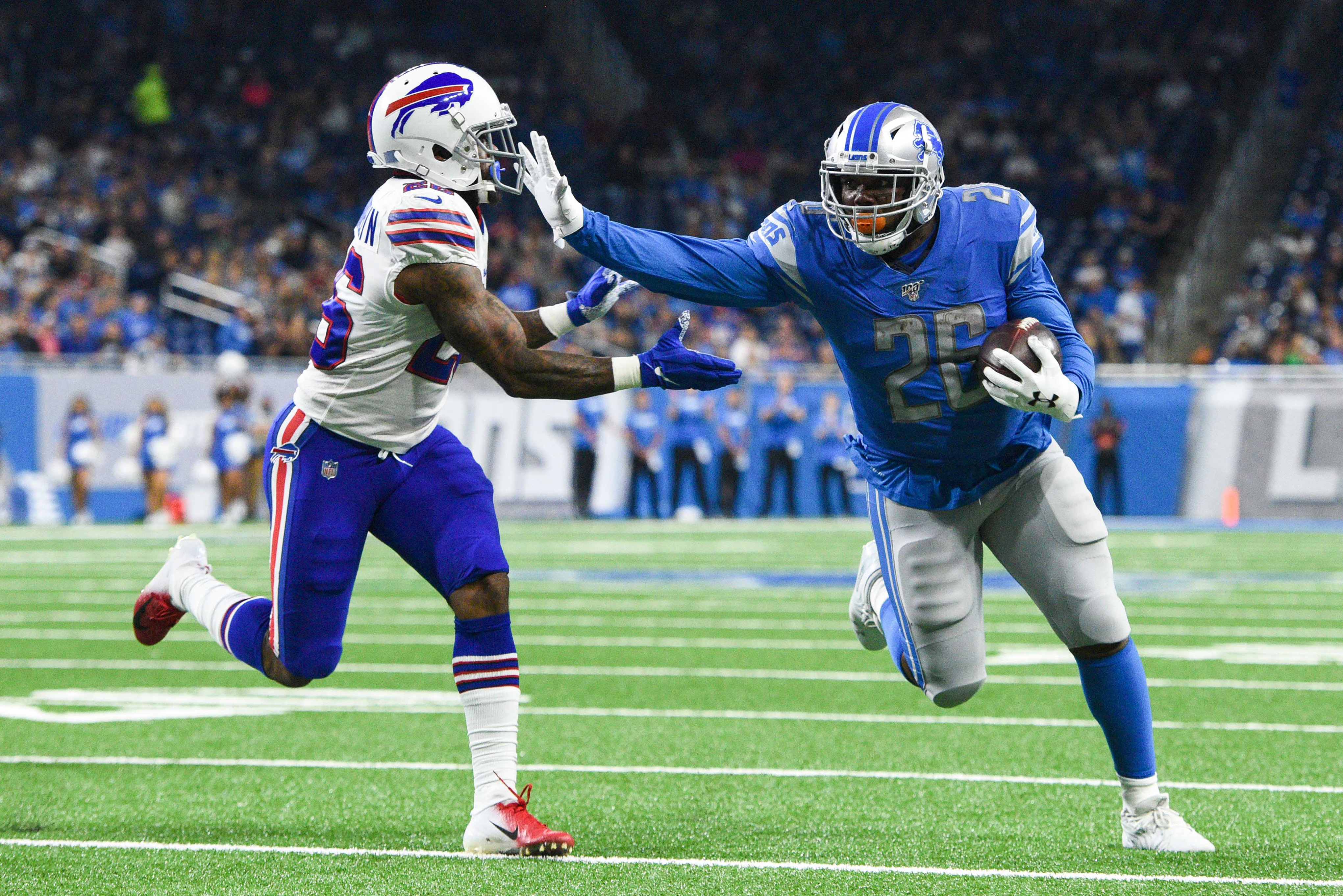 Aug 23, 2019; Detroit, MI, USA; Detroit Lions running back C.J. Anderson (26) runs the ball as Buffalo Bills defensive back Captain Munnerlyn (26) atemps to tackle during the second quarter at Ford Field. Mandatory Credit: Tim Fuller-USA TODAY Sports / Tim Fuller