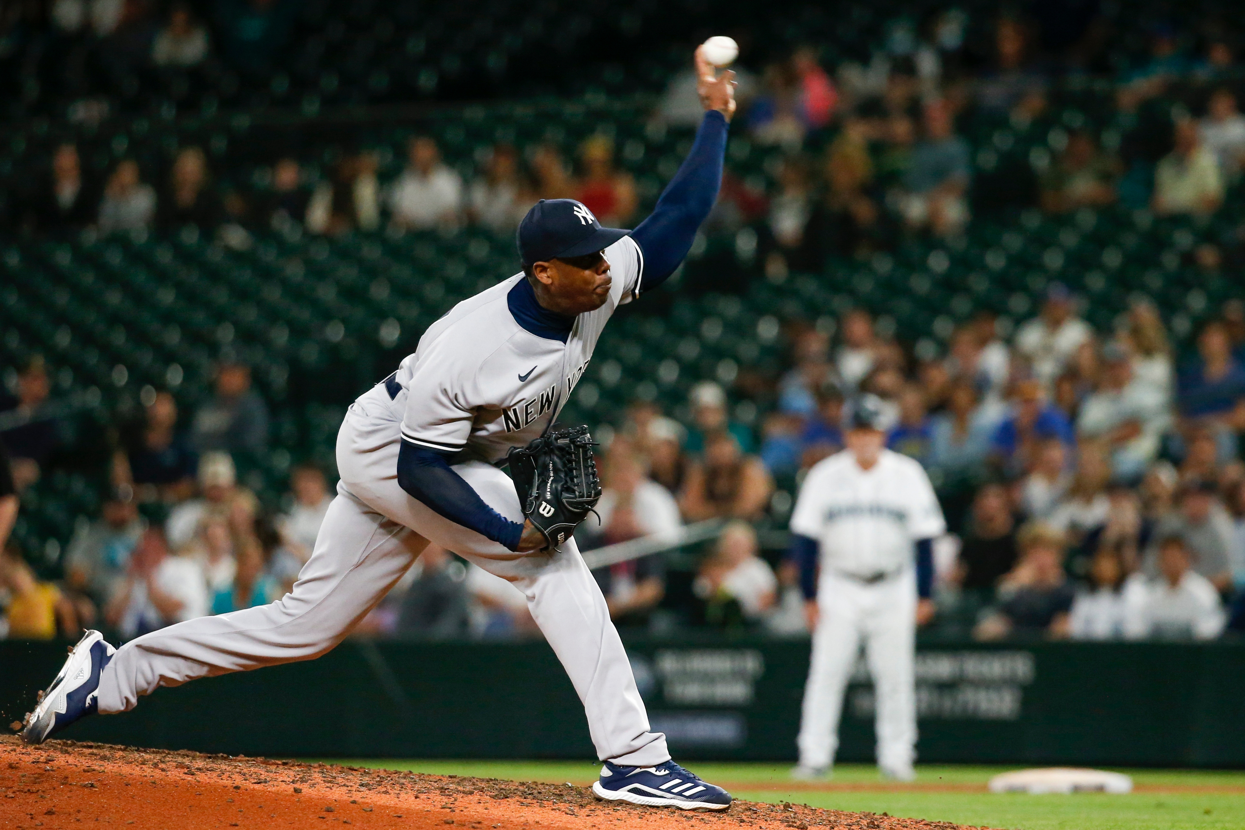 Jul 6, 2021; Seattle, Washington, USA; New York Yankees relief pitcher Aroldis Chapman (54) throws against the Seattle Mariners during the ninth inning at T-Mobile Park. Mandatory Credit: Joe Nicholson-USA TODAY Sports / Joe Nicholson-USA TODAY Sports