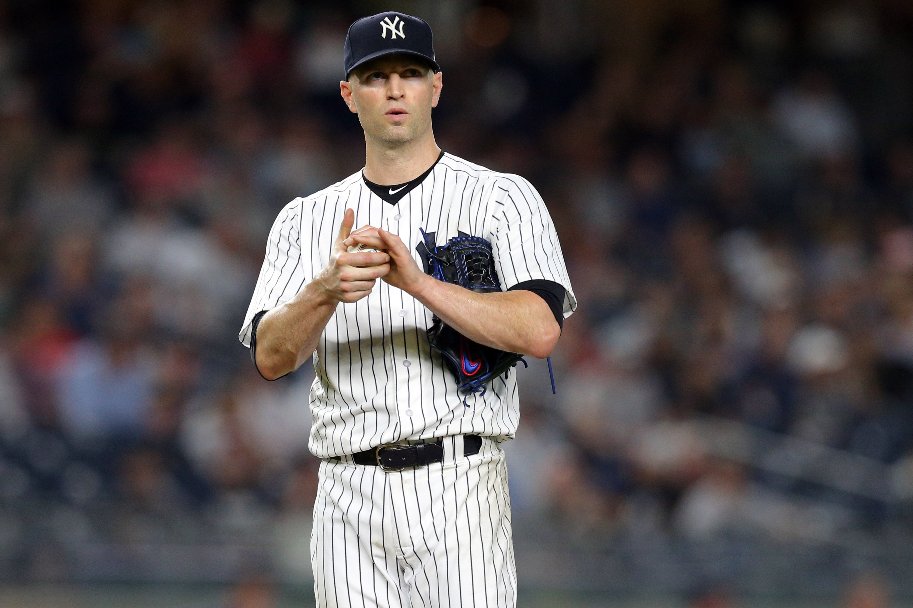 Sep 18, 2018; Bronx, NY, USA; New York Yankees starting pitcher J.A. Happ (34) reacts during the third inning against the Boston Red Sox at Yankee Stadium. Mandatory Credit: Brad Penner-USA TODAY Sports / Brad Penner