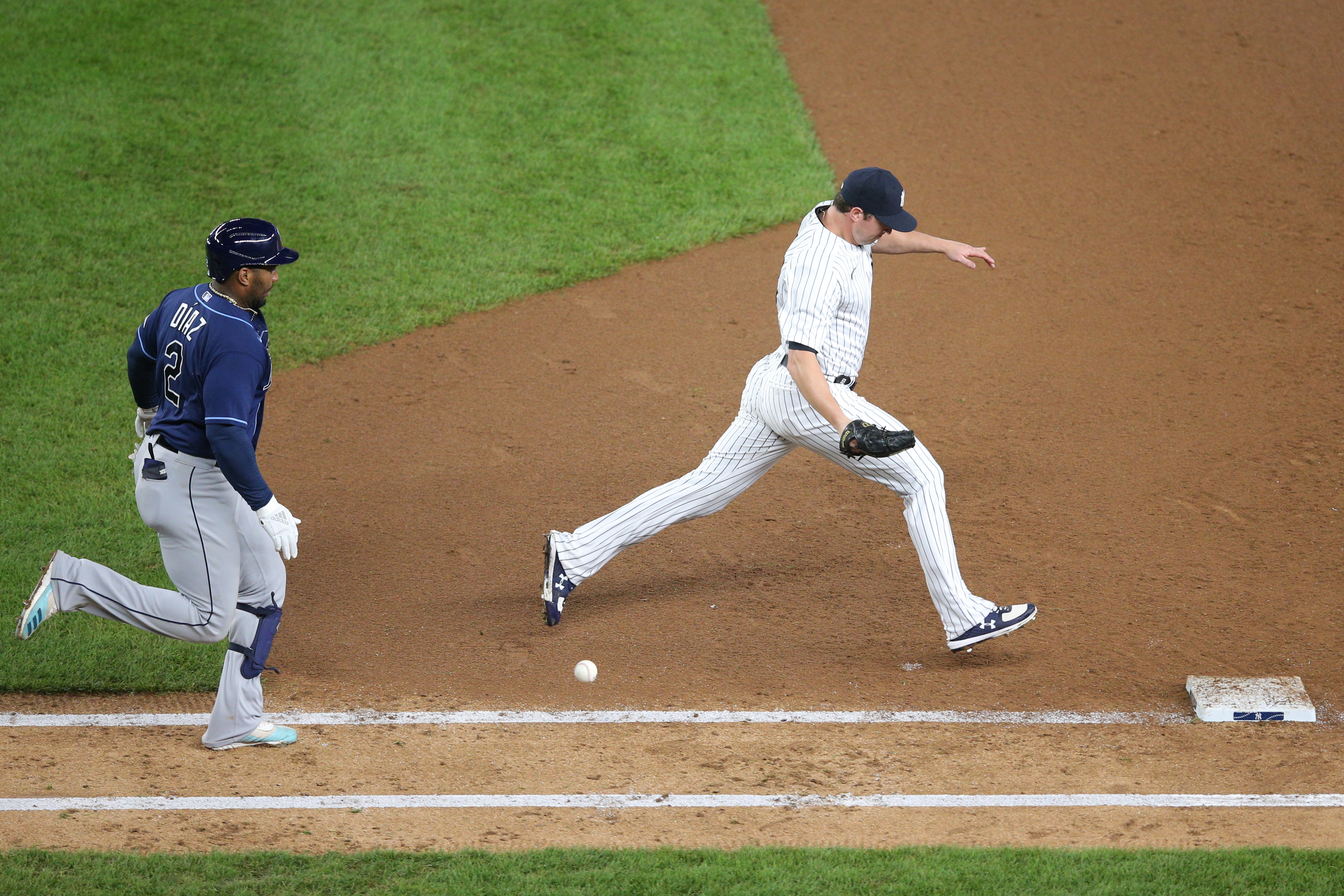 Aug 19, 2020; Bronx, New York, USA; Tampa Bay Rays third baseman Yandy Diaz (2) reaches second base safely after New York Yankees relief pitcher Zack Britton (53) mishandles a throw while covering first base on a ground ball during the eighth inning at Yankee Stadium. / Brad Penner-USA TODAY Sports