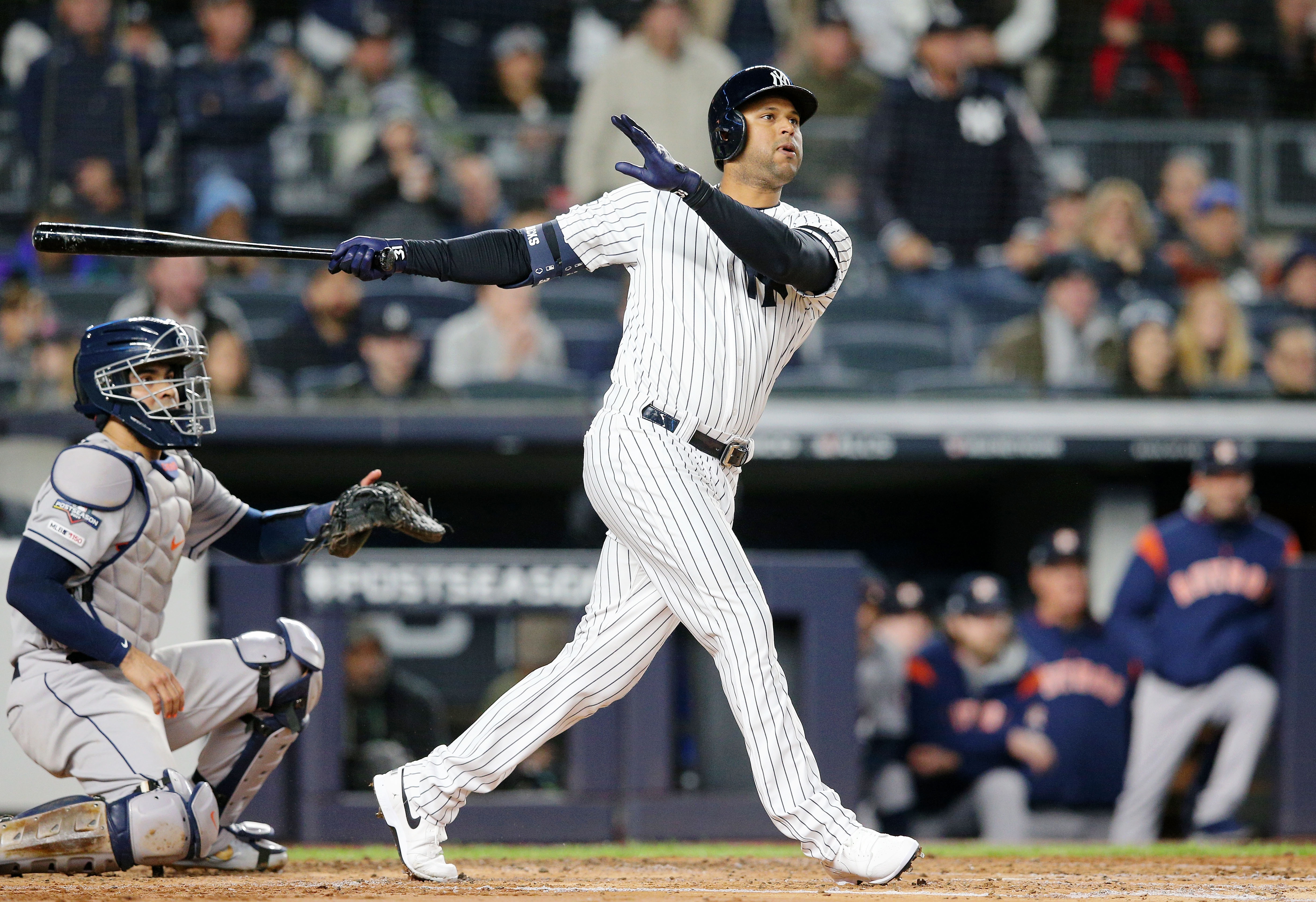 Oct 18, 2019; Bronx, NY, USA; New York Yankees center fielder Aaron Hicks (31) watches his three run home run against the Houston Astros during the first inning of game five of the 2019 ALCS playoff baseball series at Yankee Stadium. Mandatory Credit: Brad Penner-USA TODAY Sports / Brad Penner