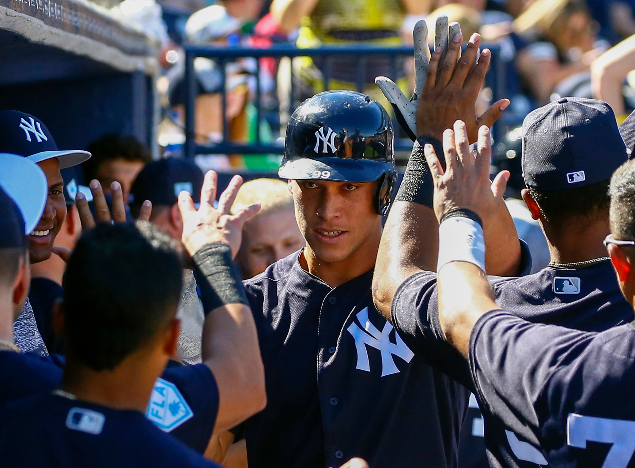 New York Yankees right fielder Aaron Judge celebrates with teammates after hitting a two run home run during the fifth inning against the Detroit Tigers at George M. Steinbrenner Field. / Butch Dill/USA TODAY Sports