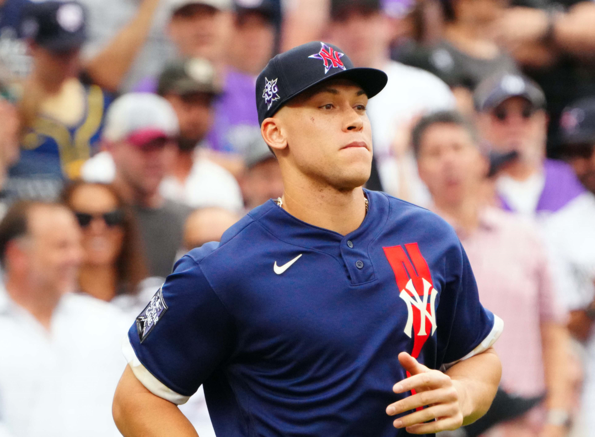 Jul 13, 2021; Denver, Colorado, USA; American League right fielder Aaron Judge of the New York Yankees (99) is introduced prior to the 2021 MLB All Star Game at Coors Field. Mandatory Credit: Mark J. Rebilas-USA TODAY Sports / Mark J. Rebilas-USA TODAY Sports