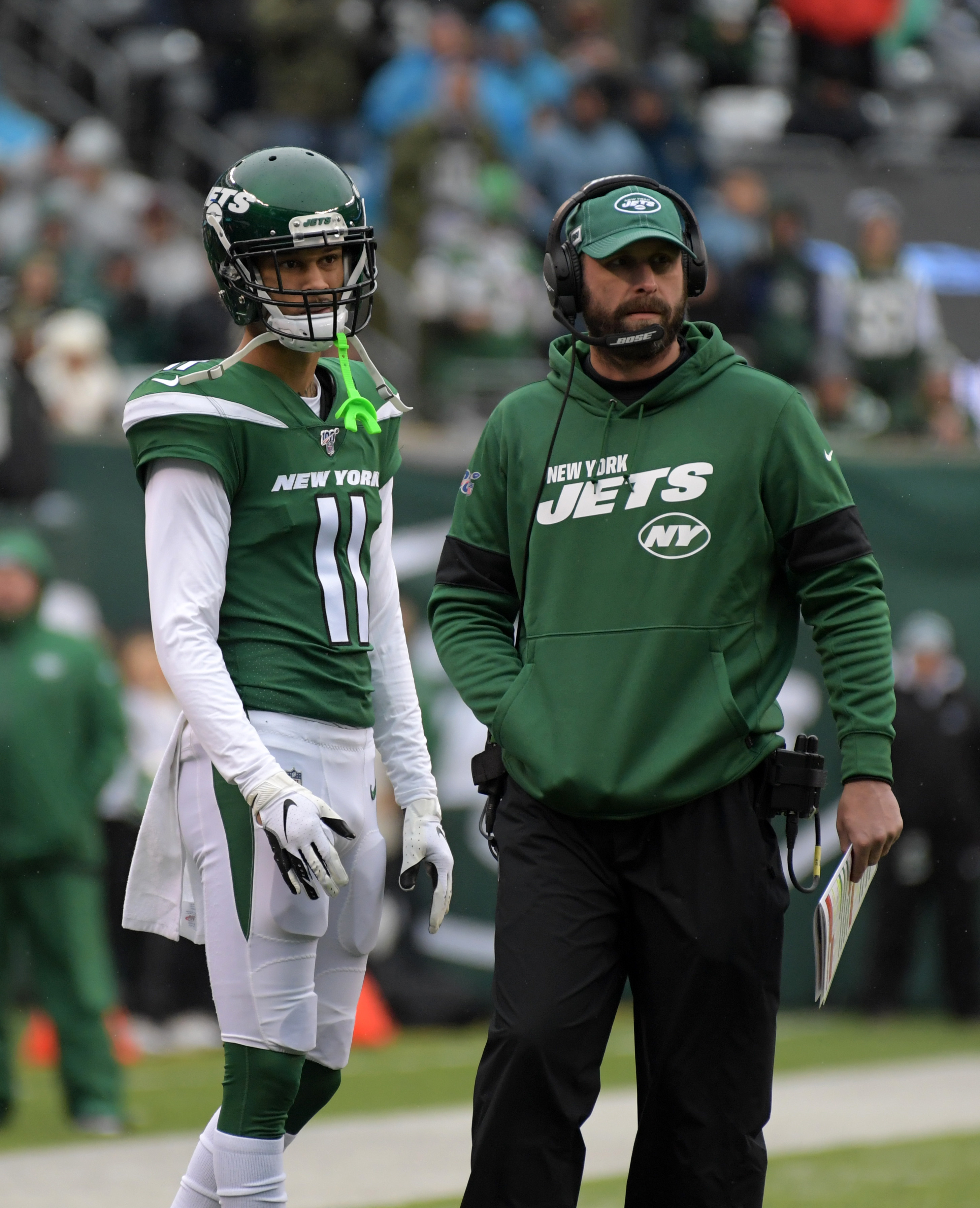 Nov 24, 2019; East Rutherford, NJ, USA; New York Jets head coach Adam Gase and wide receiver Robby Anderson (11) watch from the sidelines in the second quarter against the Oakland Raiders at MetLife Stadium. The Jets defeated the Raiders 34-3. Mandatory Credit: Kirby Lee-USA TODAY Sports / Kirby Lee