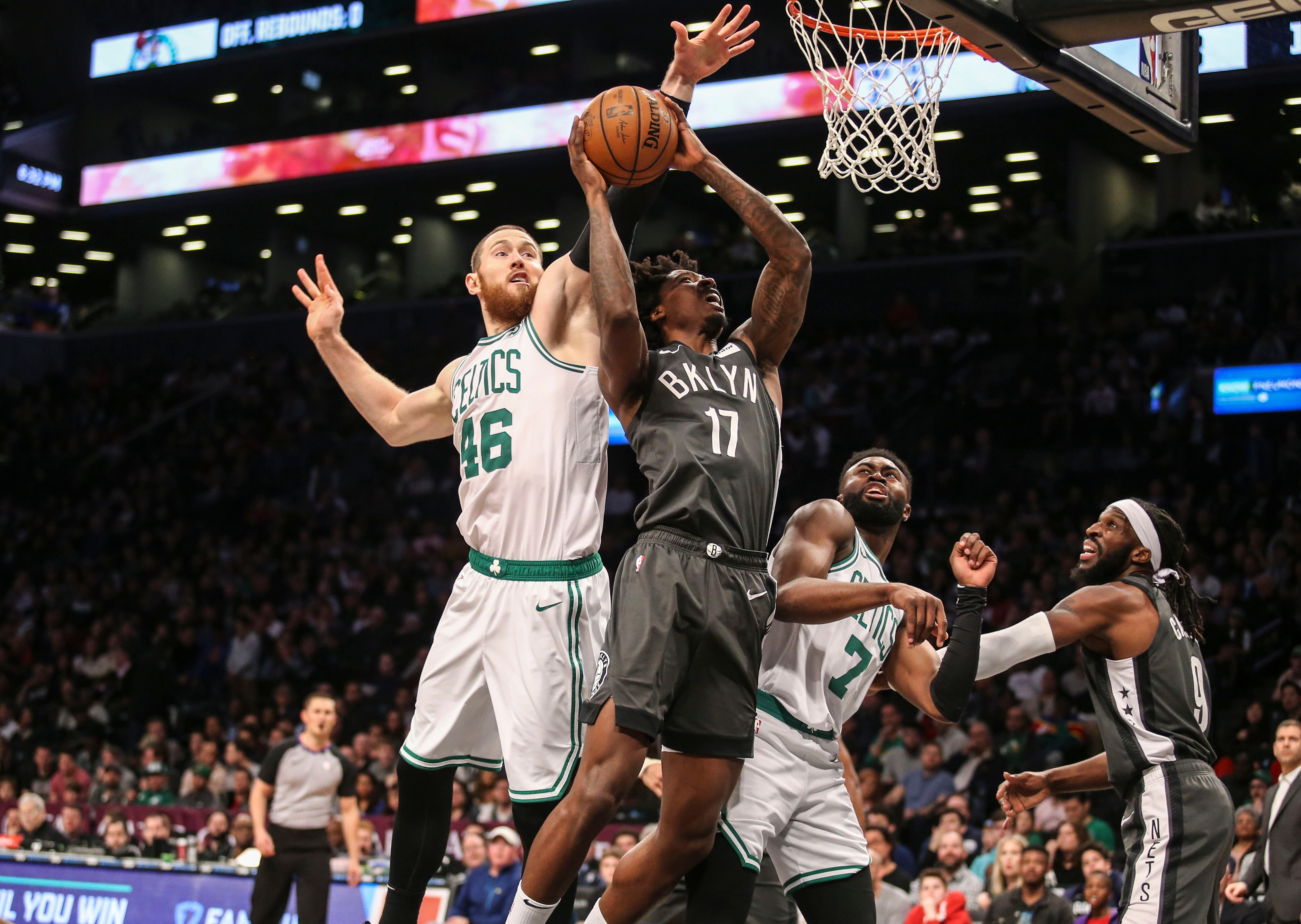 Mar 30, 2019; Brooklyn, NY, USA; Brooklyn Nets forward Ed Davis (17) drives past Boston Celtics forward Aron Baynes (46) in the second quarter against at Barclays Center. Mandatory Credit: Wendell Cruz-USA TODAY Sports / Wendell Cruz
