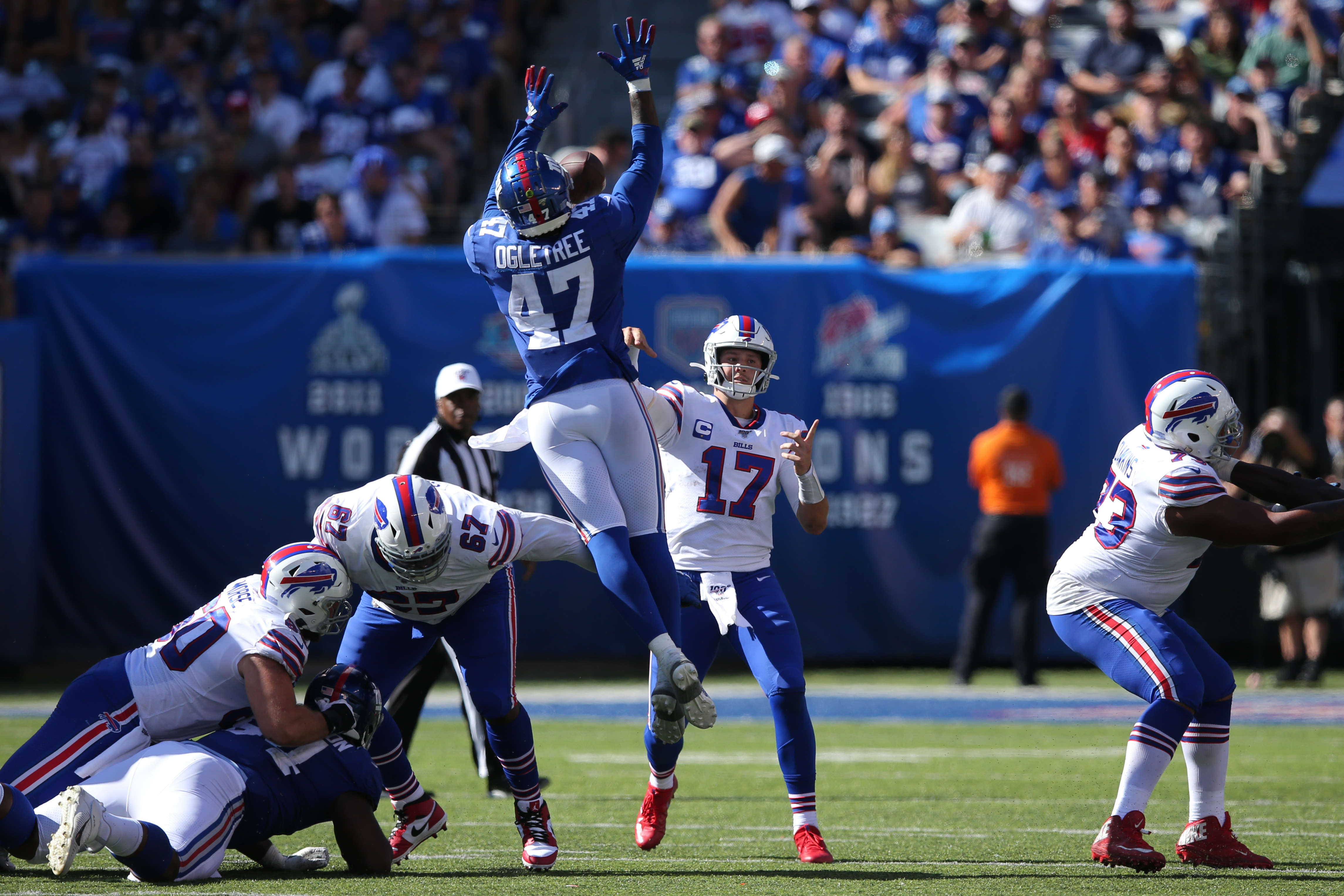 Sep 15, 2019; East Rutherford, NJ, USA; New York Giants linebacker Alec Ogletree (47) knocks down a pass by Buffalo Bills quarterback Josh Allen (17) during the fourth quarter at MetLife Stadium. Mandatory Credit: Brad Penner-USA TODAY Sports / Brad Penner