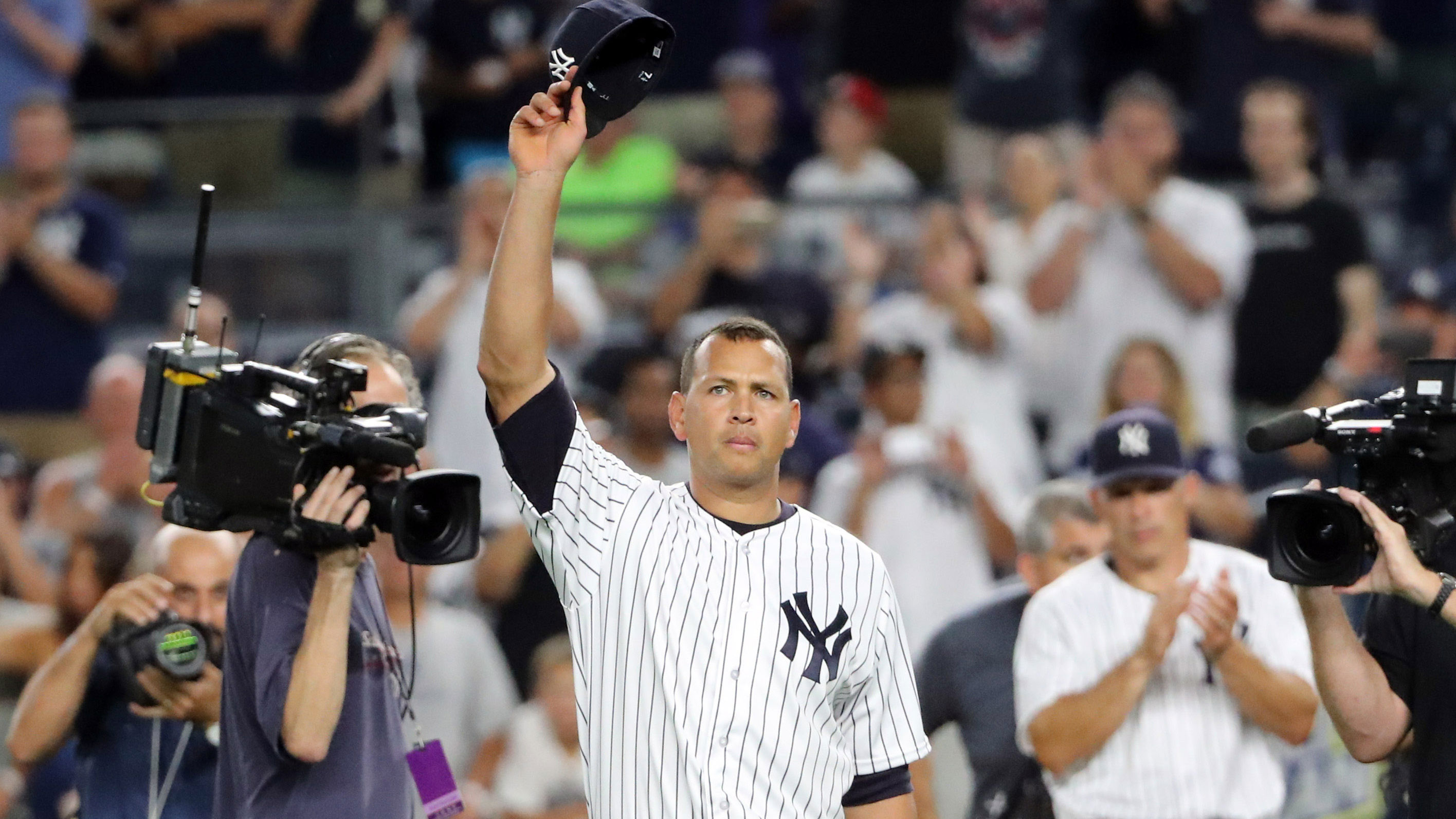 Aug 12, 2016; Bronx, NY, USA; New York Yankees designated hitter Alex Rodriguez (13) tips his cap in a farewell gesture to the fans after the game against the Tampa Bay Rays at Yankee Stadium. New York Yankees won 6-3. / Anthony Gruppuso-USA TODAY Sports