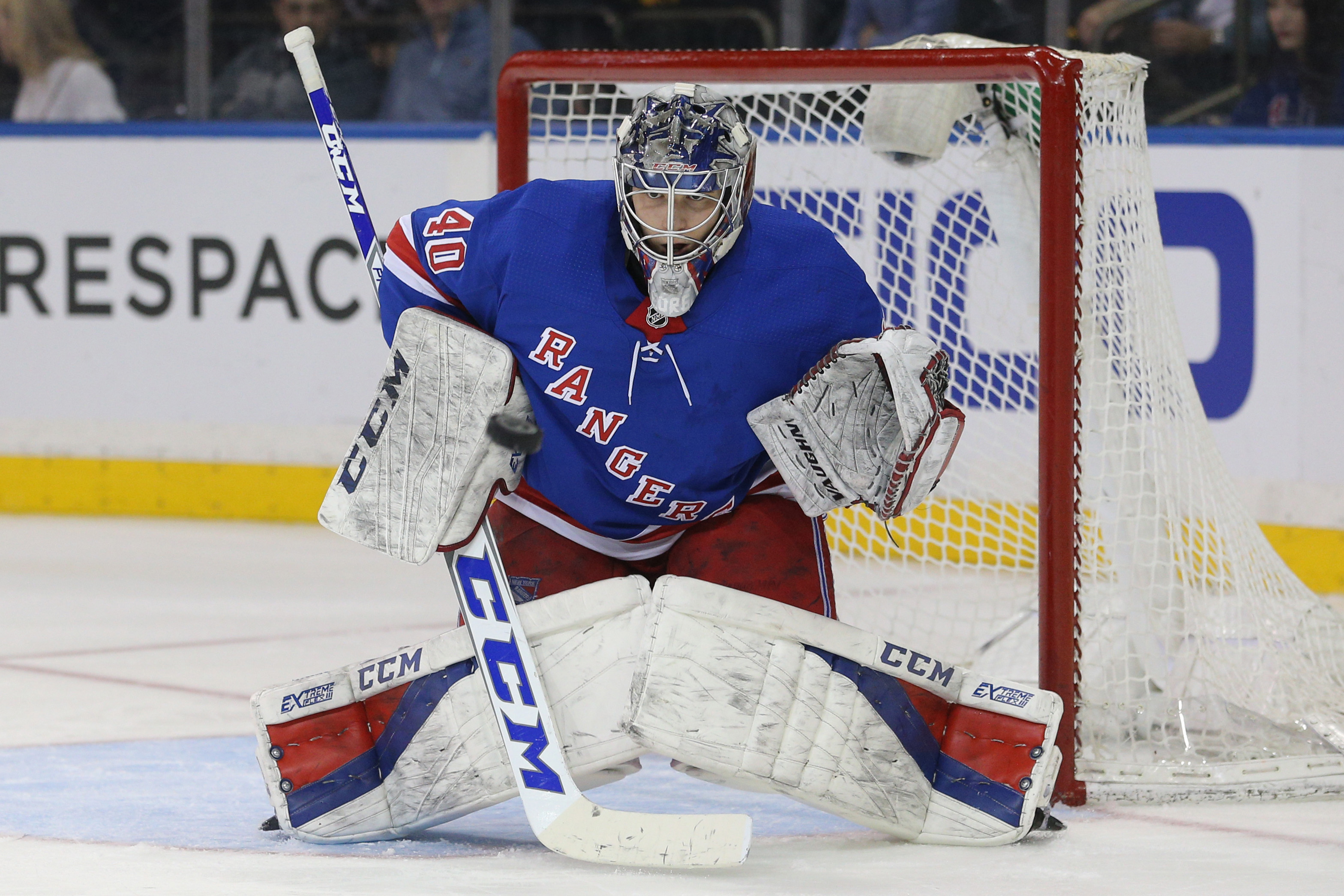 Mar 14, 2018; New York, NY, USA; New York Rangers goalie Alexandar Georgiev (40) makes a save against the Pittsburgh Penguins during the third period at Madison Square Garden. Mandatory Credit: Brad Penner-USA TODAY Sports / Brad Penner