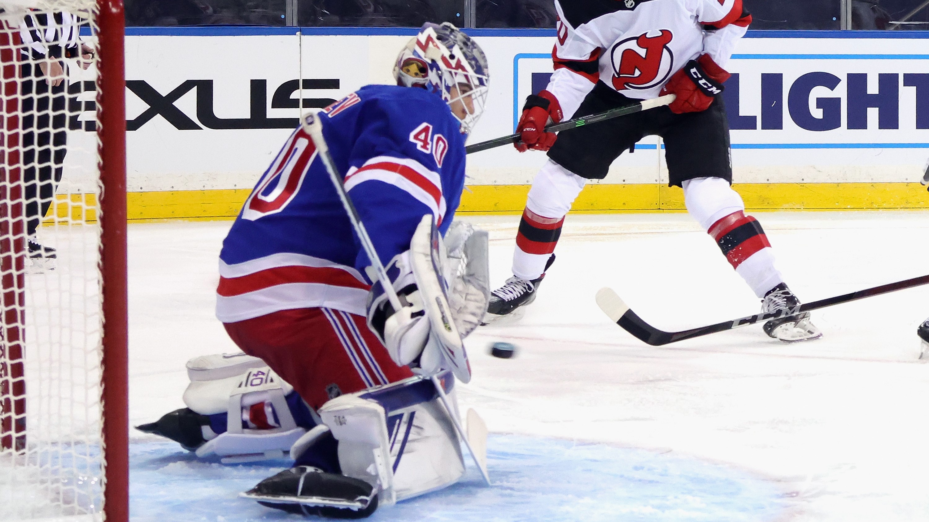 New Jersey Devils center Michael McLeod (20) looks for a rebound as New York Rangers goaltender Alexandar Georgiev (40) makes a save during the first period at Madison Square Garden. / Bruce Bennett