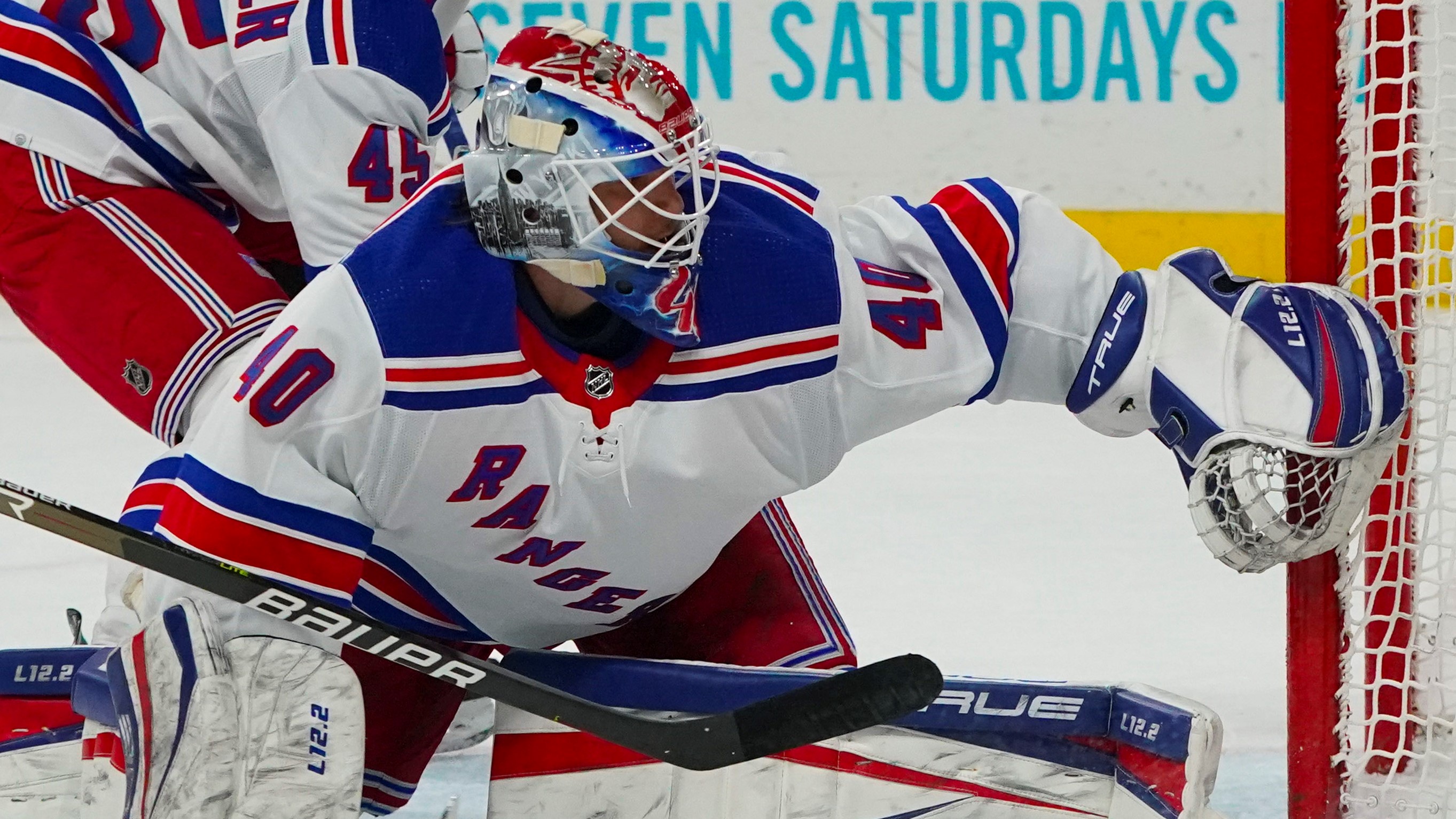 Mar 20, 2022; Raleigh, North Carolina, USA; New York Rangers goaltender Alexandar Georgiev (40) and defenseman Braden Schneider (45) watch the puck during the first period at PNC Arena. Mandatory Credit: James Guillory-USA TODAY Sports / James Guillory-USA TODAY Sports