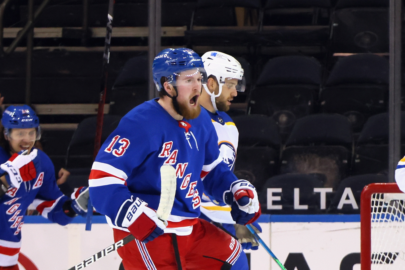 Apr 27, 2021; New York, NY, USA; Alexis Lafreniere #13 of the New York Rangers celebrates his goal at 9:49 of the third period against the Buffalo Sabres at Madison Square Garden on April 27, 2021 in New York City. Mandatory Credit: Bruce Bennett/Pool Photo-USA TODAY Sports / Bruce Bennett/Pool Photo-USA TODAY Sports