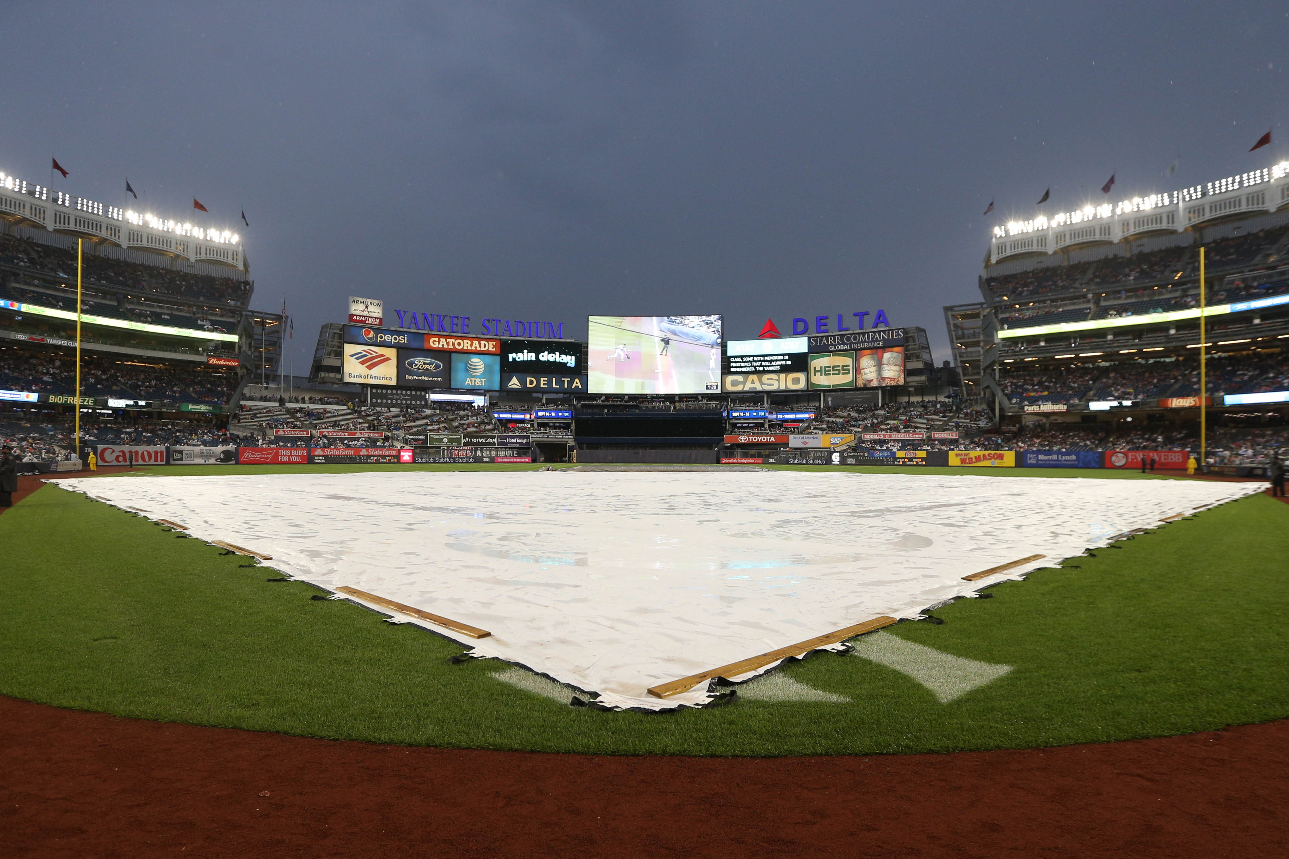General view of a tarp on the field as the scoreboard at Yankee Stadium informs fans of a rain delay before a game between the New York Yankees and the Kansas City Royals. / Brad Penner/USA TODAY Sports