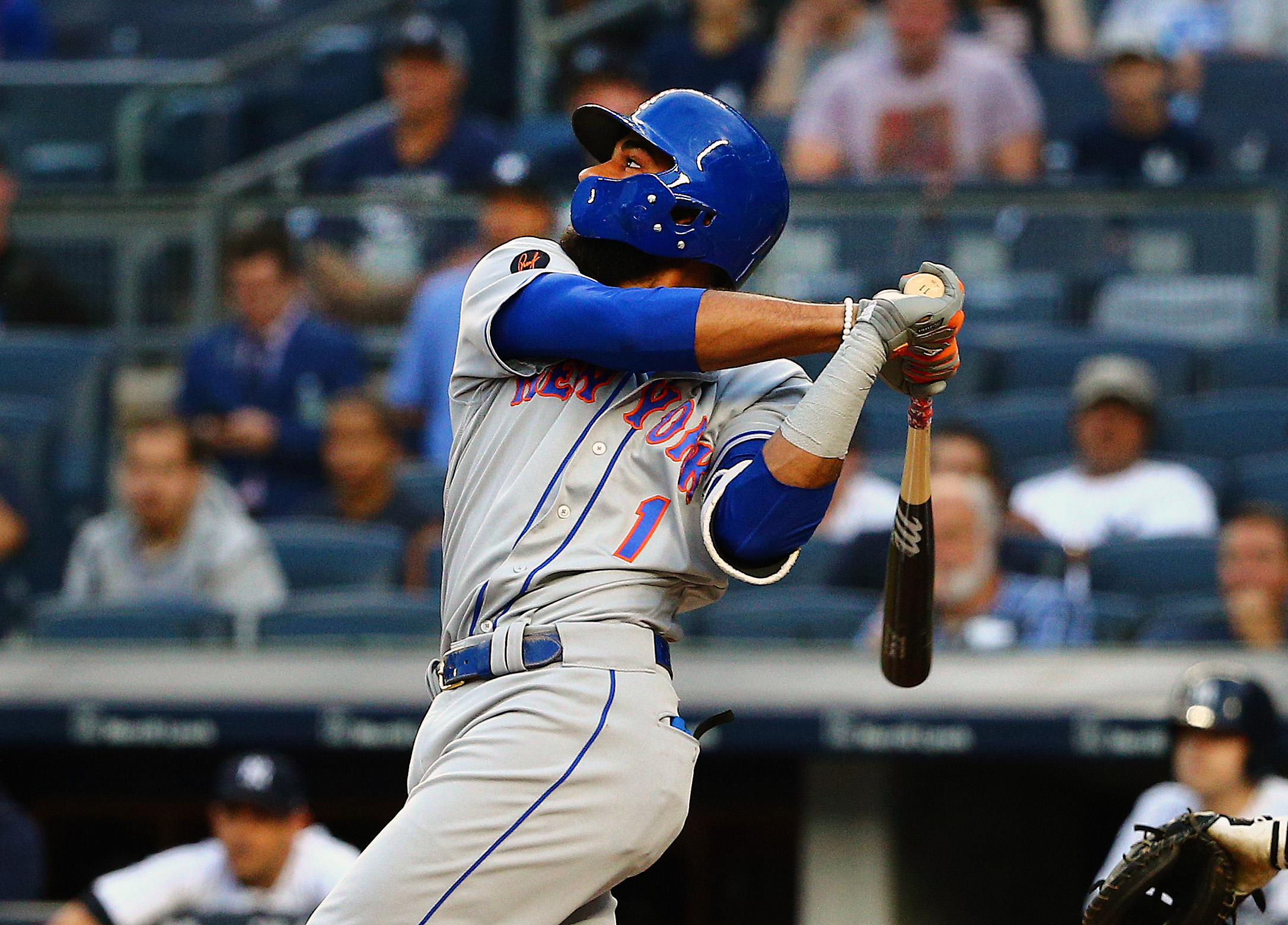 Aug 13, 2018; Bronx, NY, USA; New York Mets shortstop Amed Rosario (1) hits a solo home run against the New York Yankees during the first inning at Yankee Stadium. Mandatory Credit: Andy Marlin-USA TODAY Sports / Andy Marlin