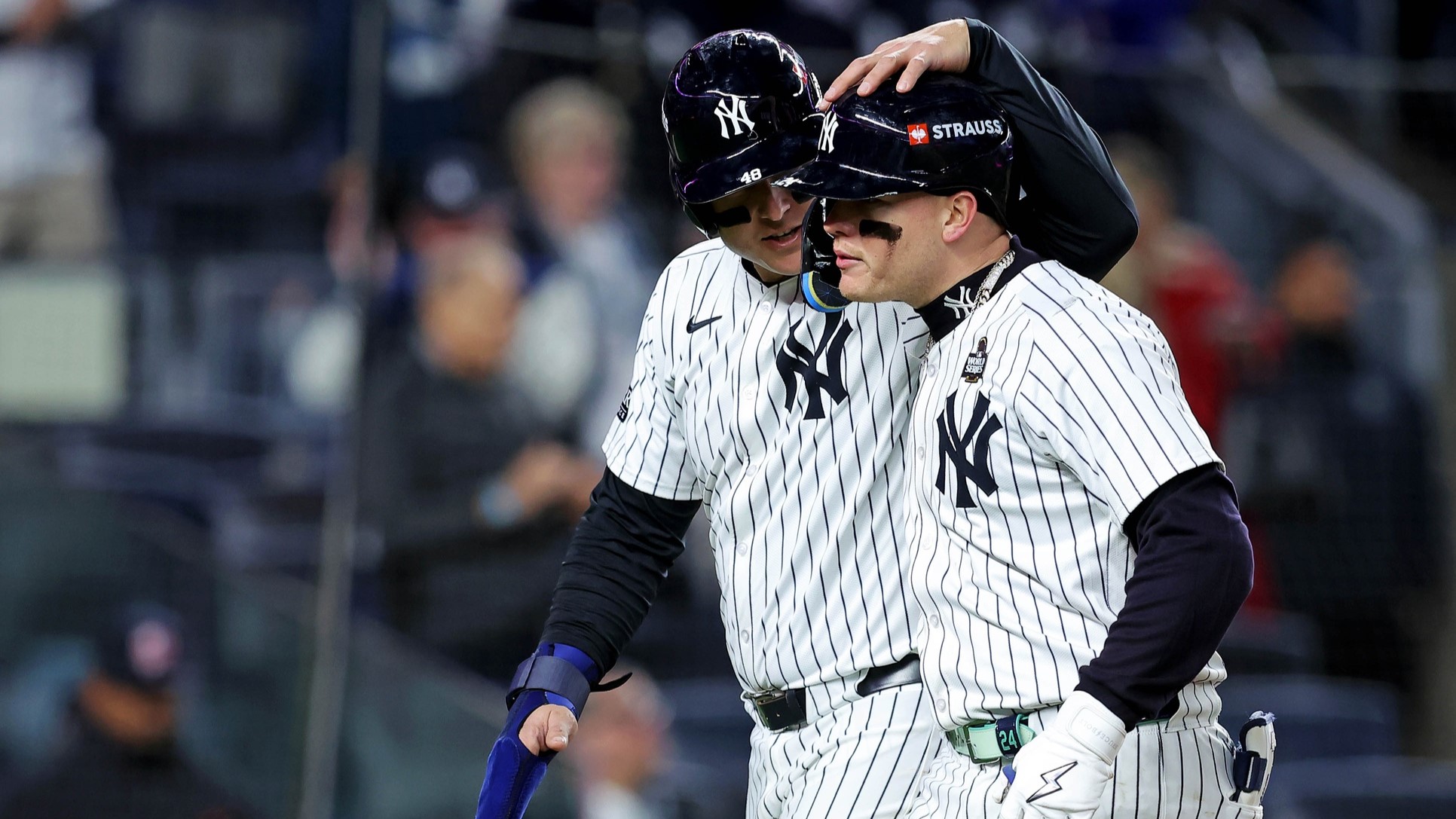 Oct 10, 2024; Kansas City, Missouri, USA; New York Yankees outfielder Aaron Judge (99) smiles while leaving the field following a win over the Kansas City Royals during game four of the ALDS for the 2024 MLB Playoffs at Kauffman Stadium. / Denny Medley-Imagn Images