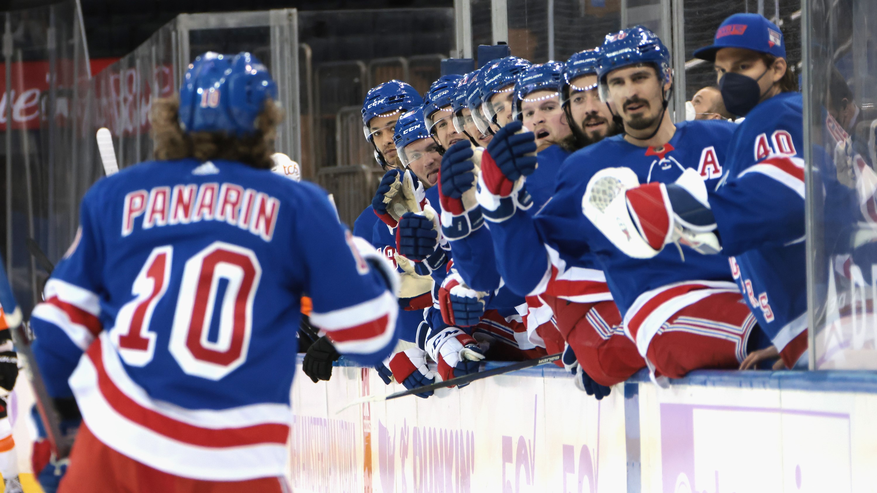 Artemi Panarin #10 of the New York Rangers celebrates his second period goal against the Philadelphia Flyers at Madison Square Garden on March 15, 2021 in New York City. / Bruce Bennett