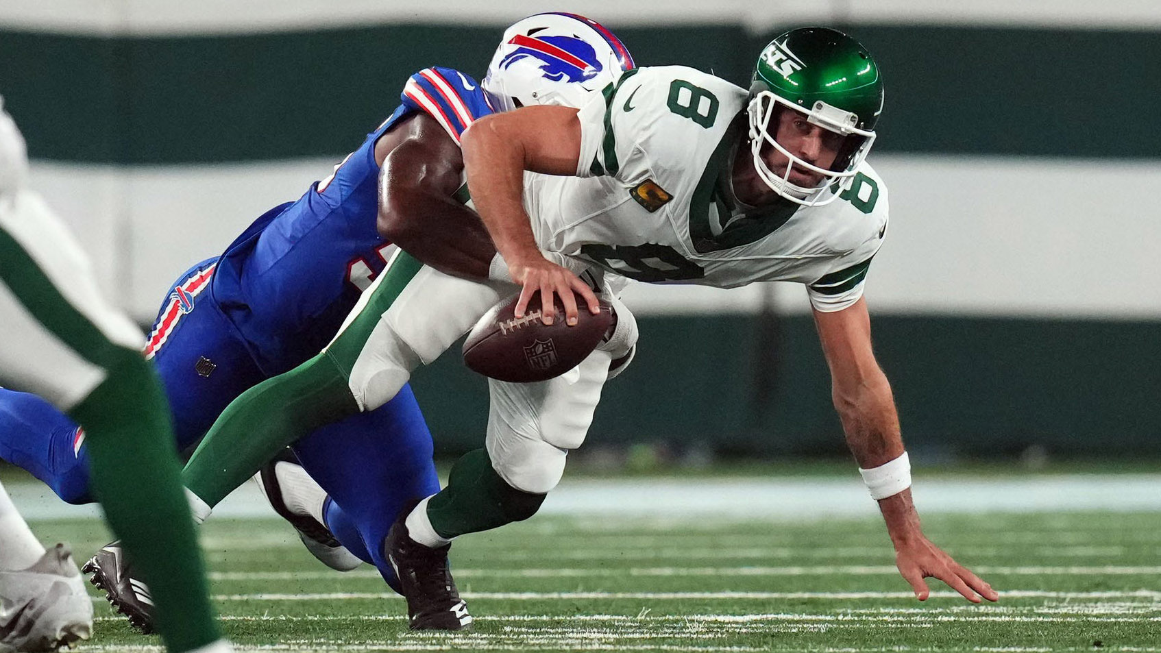 Artificial surfaces again drawing criticism following Aaron Rodgers' Achilles injury in Jets' openerCommissioner Roger Goodell, NFLPA, and players around the league have weighed in9/13/2023, 3:29 PMAlex SmithEditorial ProducerNew York Jets quarterback Aaron Rodgers (8) is injured after a sack by Buffalo Bills defensive end Leonard Floyd (not pictured) during the first quarter at MetLife Stadium. / Robert Deutsch-USA TODAY Sports