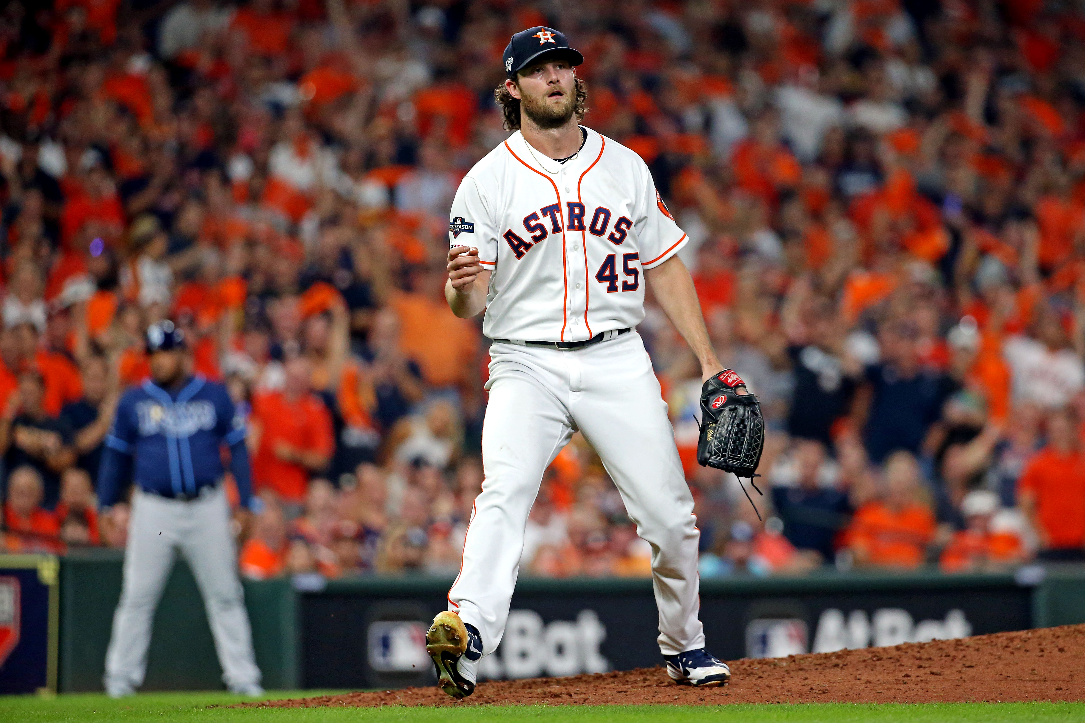 Oct 10, 2019; Houston, TX, USA; Houston Astros starting pitcher Gerrit Cole (45) reacts after a strike out during the fifth inning against the Tampa Bay Rays in game five of the 2019 ALDS playoff baseball series at Minute Maid Park. Mandatory Credit: Troy Taormina-USA TODAY Sports / Troy Taormina
