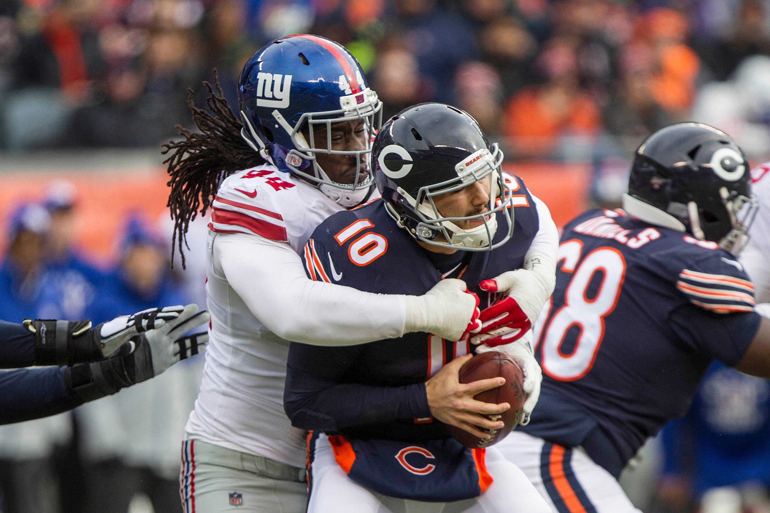 Nov 24, 2019; Chicago, IL, USA; New York Giants linebacker Markus Golden (44) sacks Chicago Bears quarterback Mitchell Trubisky (10) in the second quarter at Soldier Field. Mandatory Credit: Kena Krutsinger-USA TODAY Sports / Kena Krutsinger