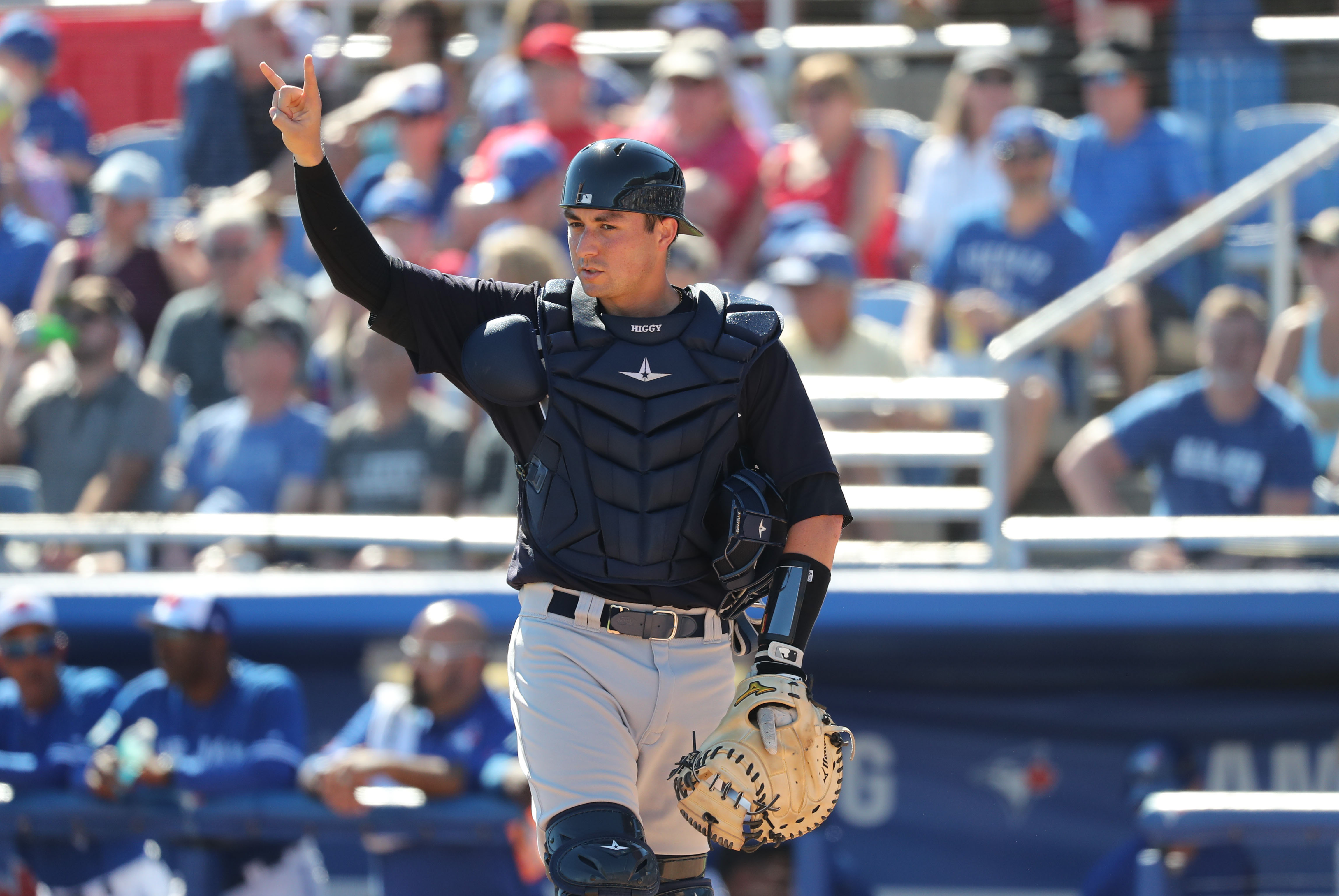 Mar 3, 2019; Dunedin, FL, USA; New York Yankees catcher Kyle Higashioka (66) at Dunedin Stadium. Mandatory Credit: Kim Klement-USA TODAY Sports / Kim Klement