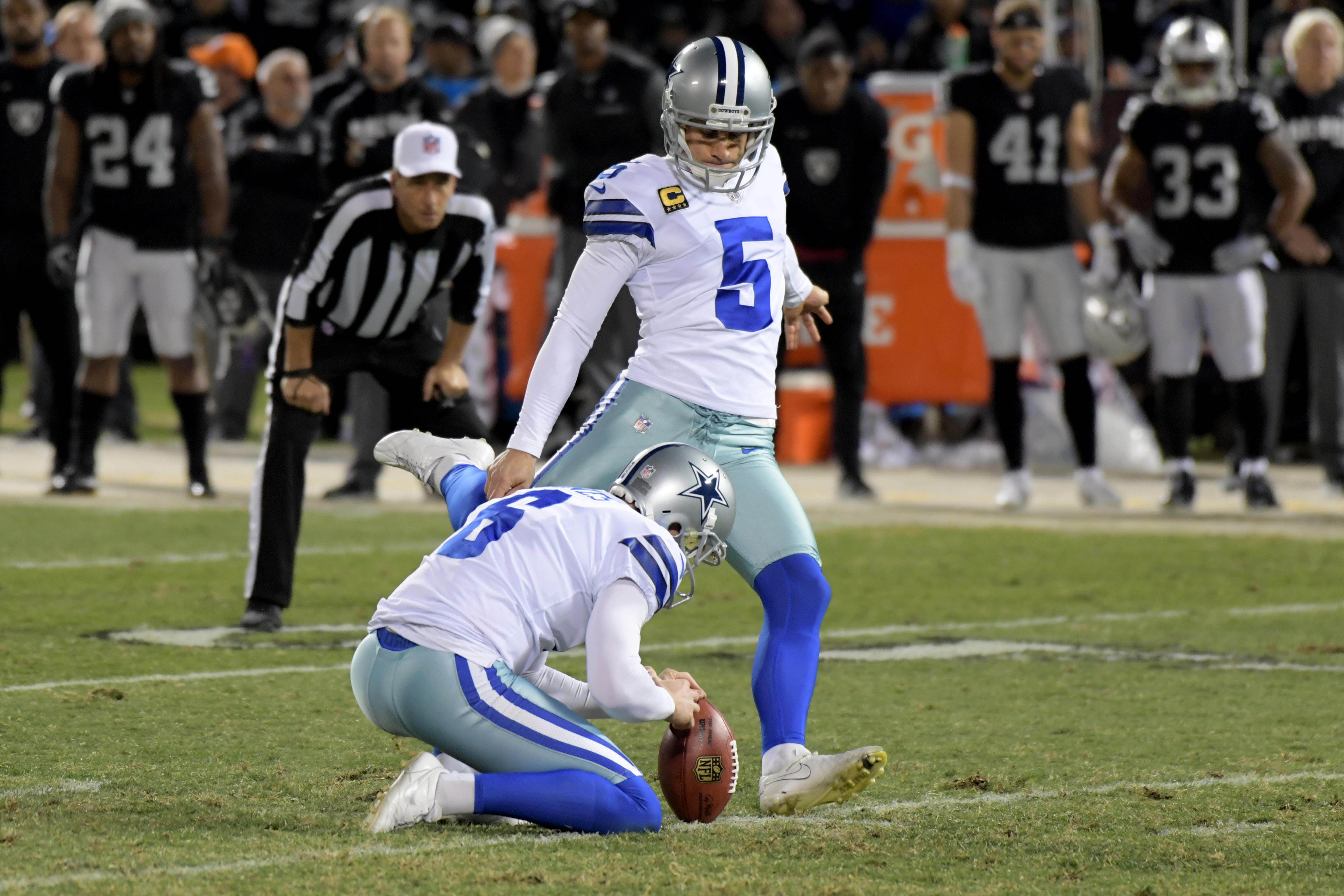 Dallas Cowboys kicker Dan Bailey kicks an extra point against the Oakland Raiders during an NFL game at Oakland-Alameda County Coliseum. / Kirby Lee/USA TODAY Sports