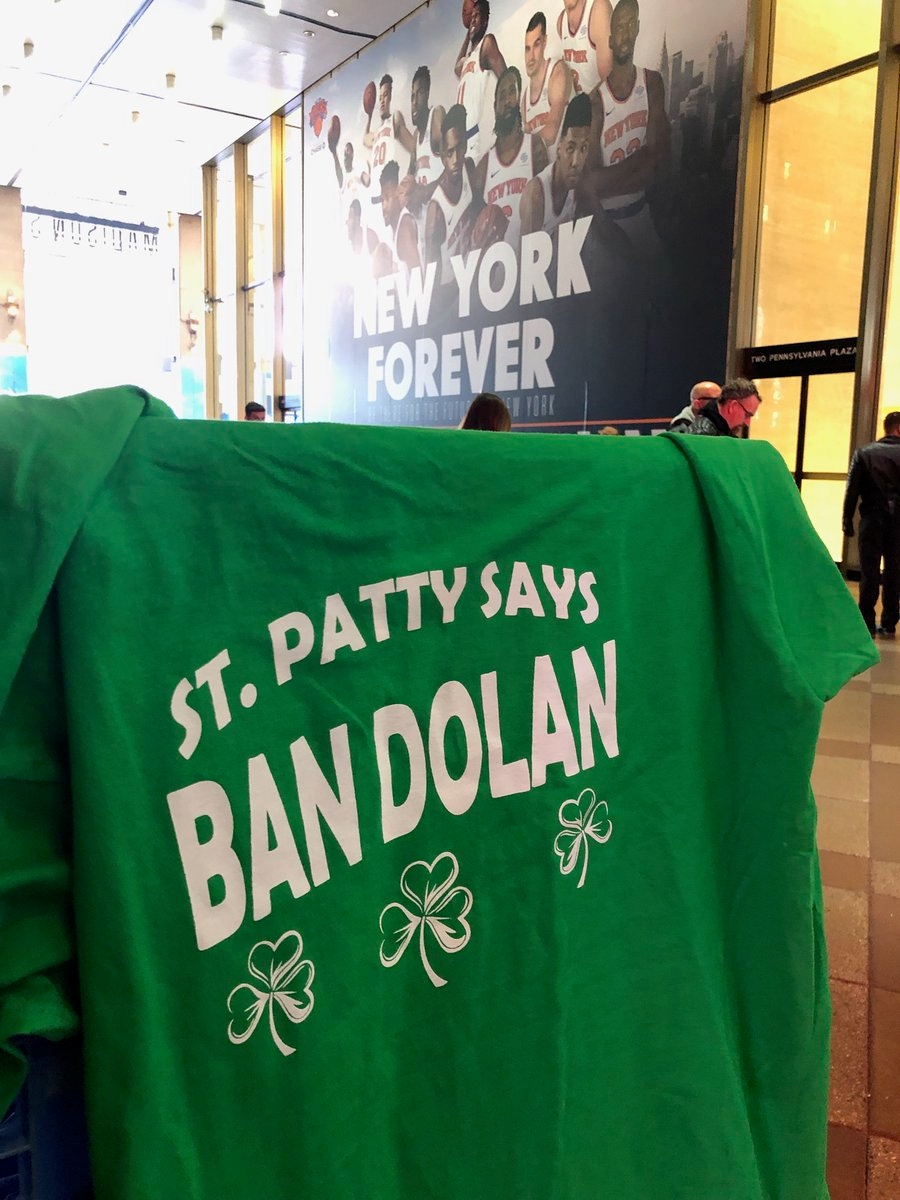 'Ban Dolan' shirts given to Knicks fans outside Madison Square GardenThe festive green shirts were not allowed into the arena by Garden security3/17/2019, 4:29 PMundefinedPhoto Courtesy of Daniel Stein