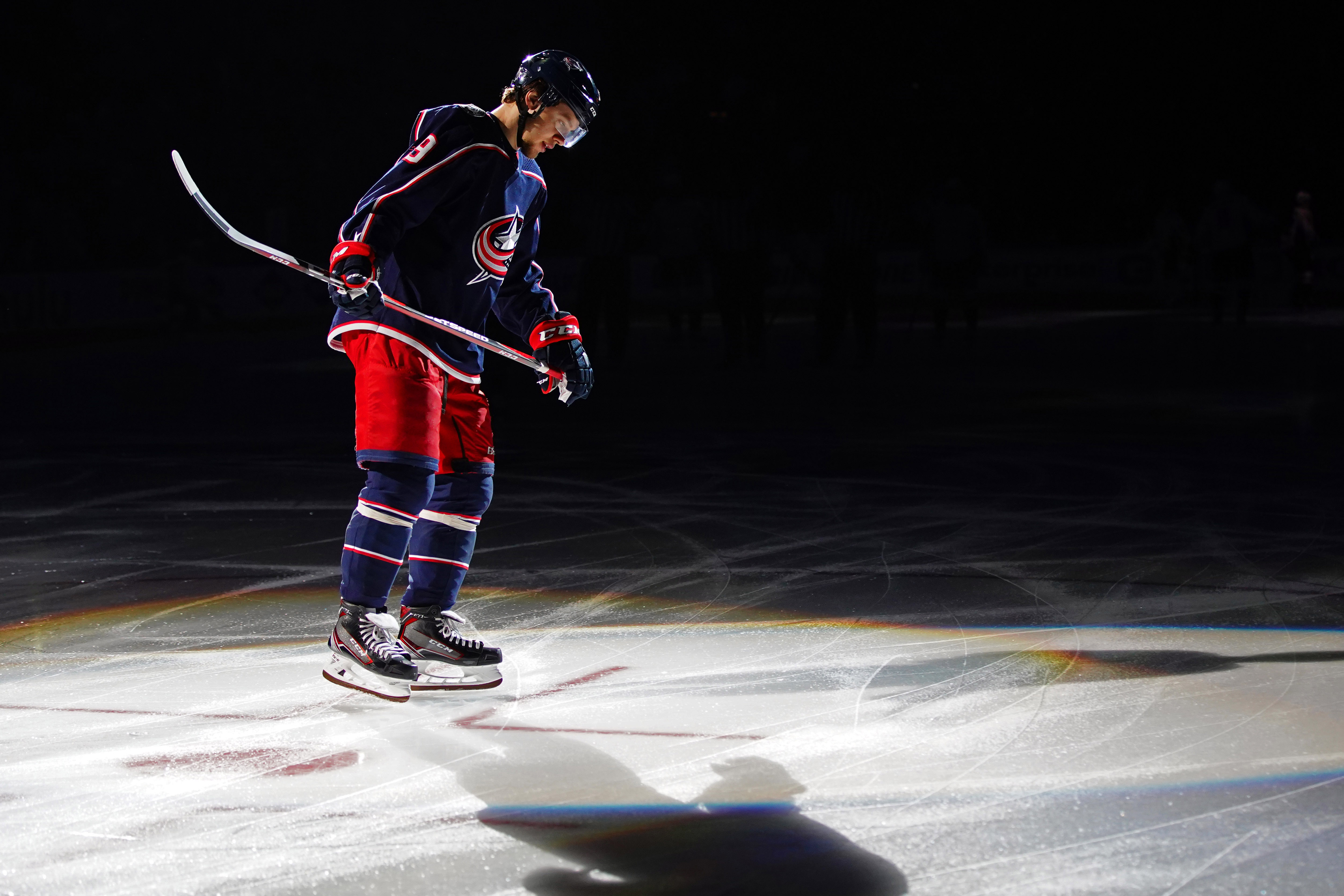 Apr 19, 2018; Columbus, OH, USA; Columbus Blue Jackets left wing Artemi Panarin (9) skates during player introductions prior to the game against the Washington Capitals in game four of the first round of the 2018 Stanley Cup Playoffs at Nationwide Arena. Mandatory Credit: Aaron Doster-USA TODAY Sports / Aaron Doster