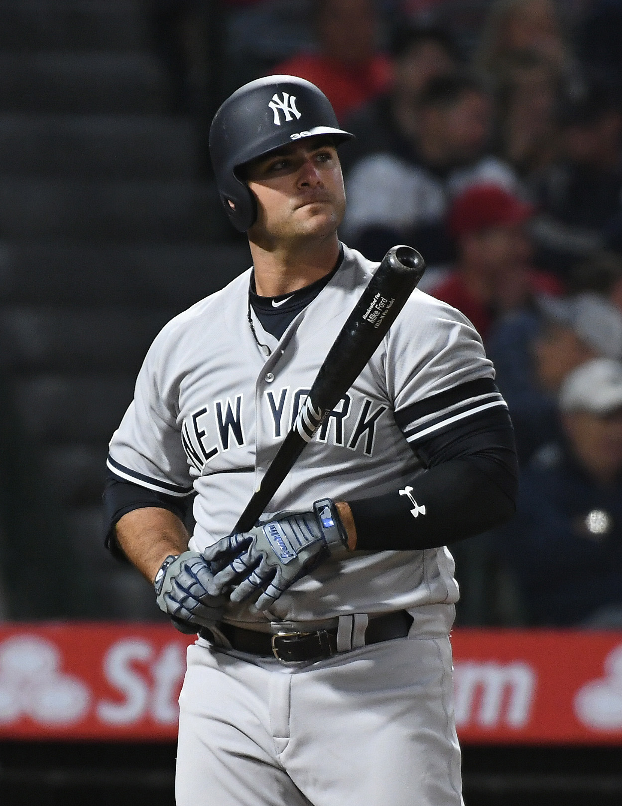 New York Yankees first baseman Mike Ford reacts after striking out in the ninth inning against the Los Angeles Angels at Angel Stadium of Anaheim. / Richard Mackson/USA TODAY Sports