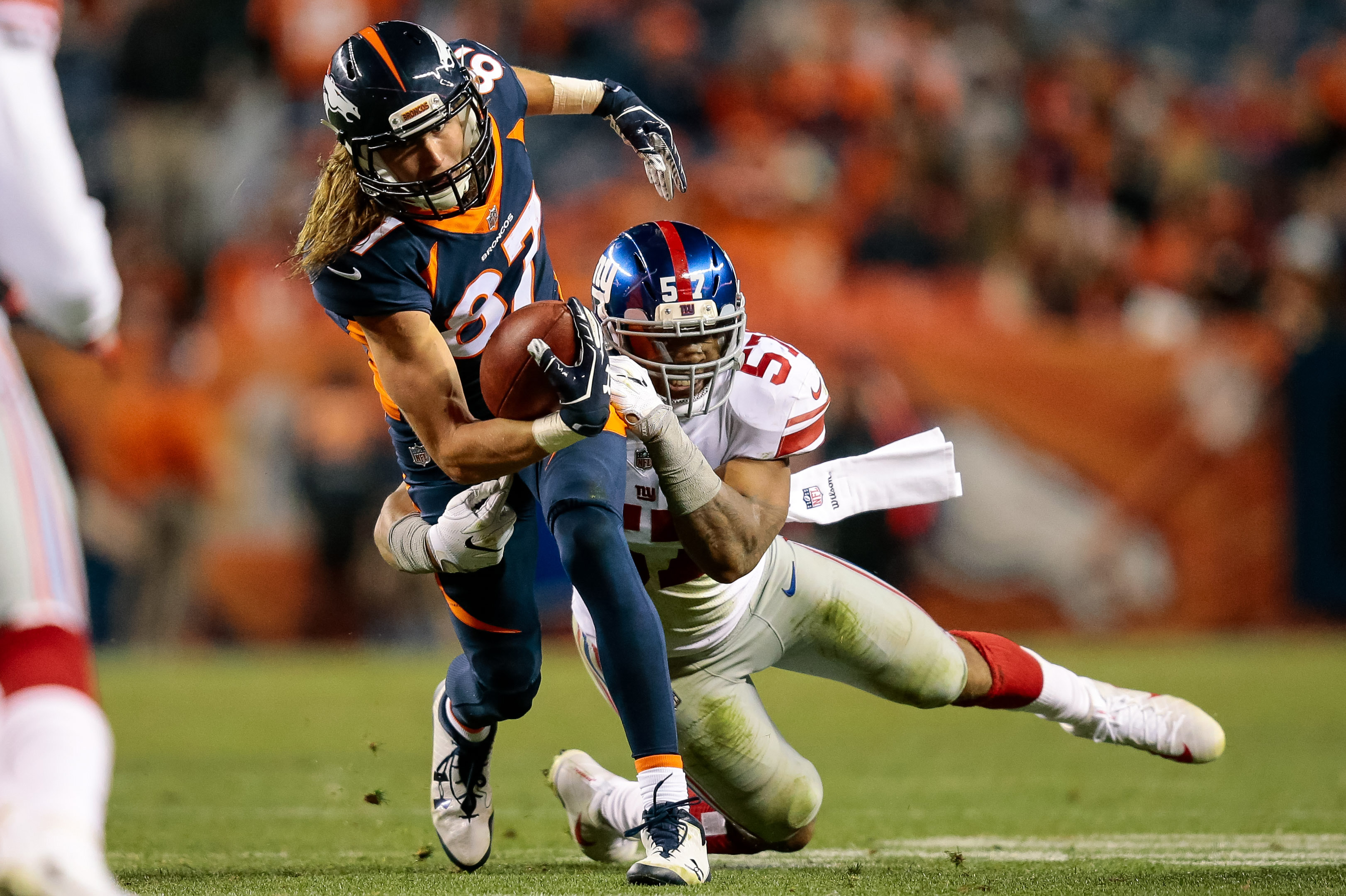New York Giants linebacker Keenan Robinson tackles Denver Broncos wide receiver Jordan Taylor in the fourth quarter at Sports Authority Field at Mile High. / Isaiah J. Downing/USA TODAY Sports