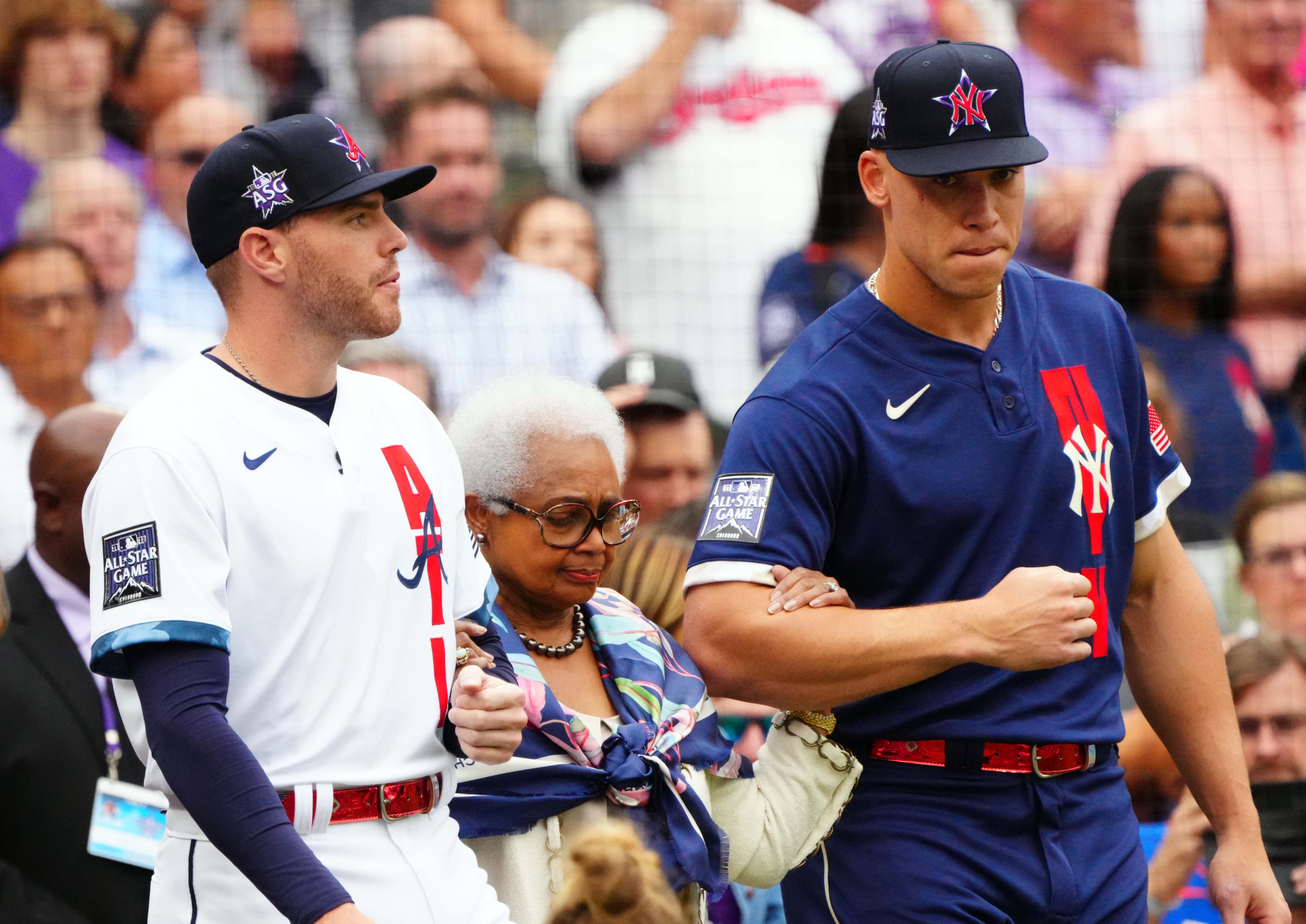 Jul 13, 2021; Denver, Colorado, USA; National League first baseman Freddie Freeman of the Atlanta Braves (5) and American League right fielder Aaron Judge of the New York Yankees (99) escort Billye Aaron, wife of the late Hank Aaron, prior to the 2021 MLB All Star Game at Coors Field. Mandatory Credit: Mark J. Rebilas-USA TODAY Sports / Mark J. Rebilas-USA TODAY Sports