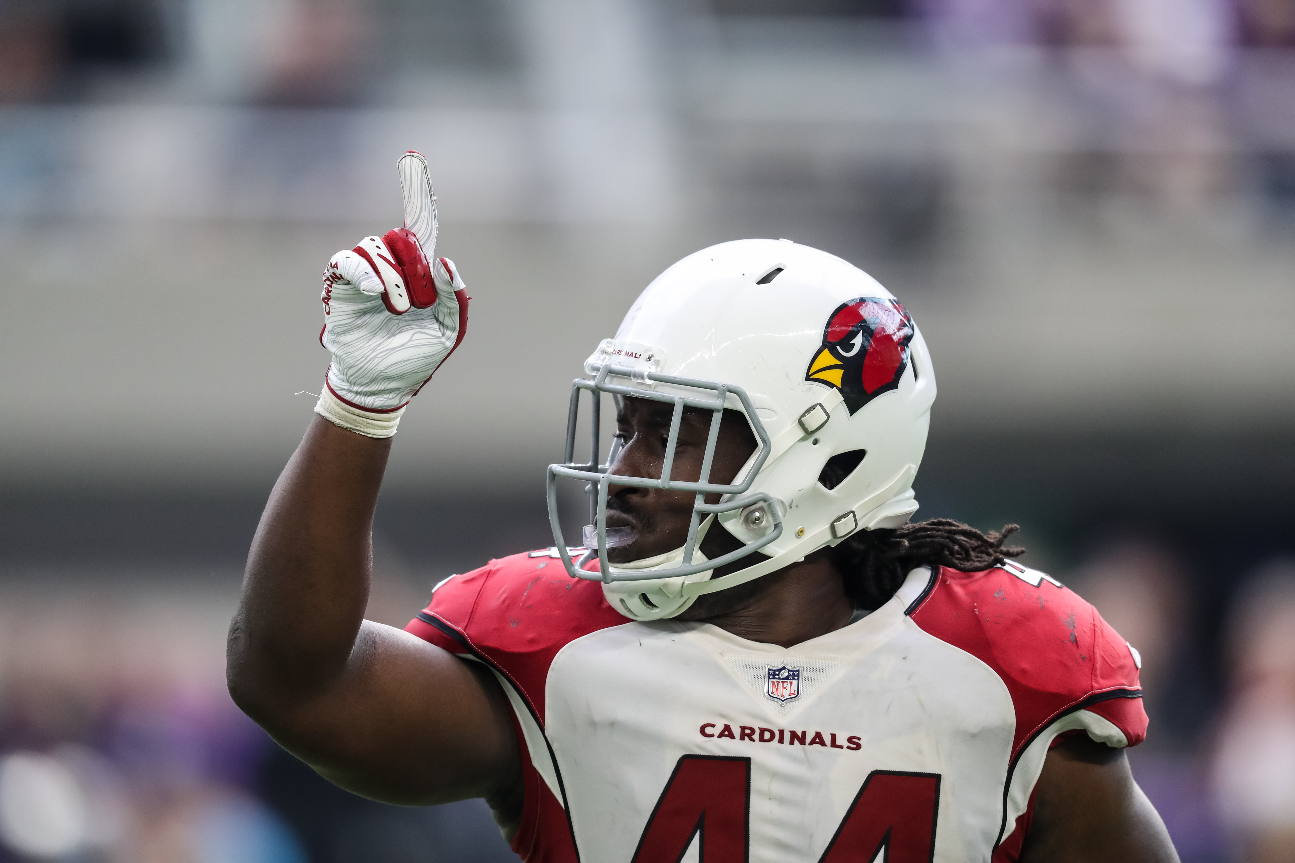 Oct 14, 2018; Minneapolis, MN, USA; Arizona Cardinals defensive end Markus Golden (44) celebrates during the fourth quarter against the Minnesota Vikings at U.S. Bank Stadium. Mandatory Credit: Brace Hemmelgarn-USA TODAY Sports / Brace Hemmelgarn