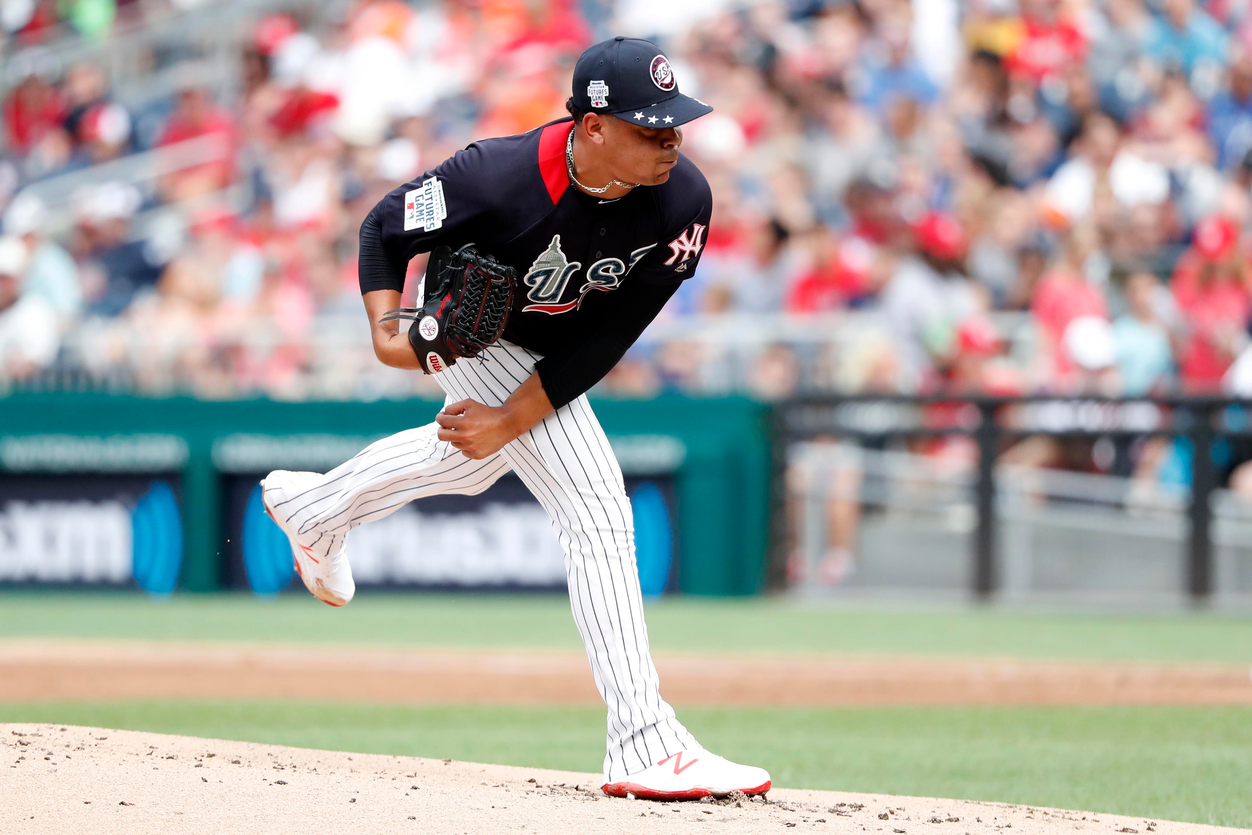 Jul 15, 2018; Washington, DC, USA; USA pitcher Justus Sheffield (4) pitches during the second inning against the World Team during the 2018 All Star Futures Game at Nationals Ballpark. Mandatory Credit: Geoff Burke-USA TODAY Sports / Geoff Burke