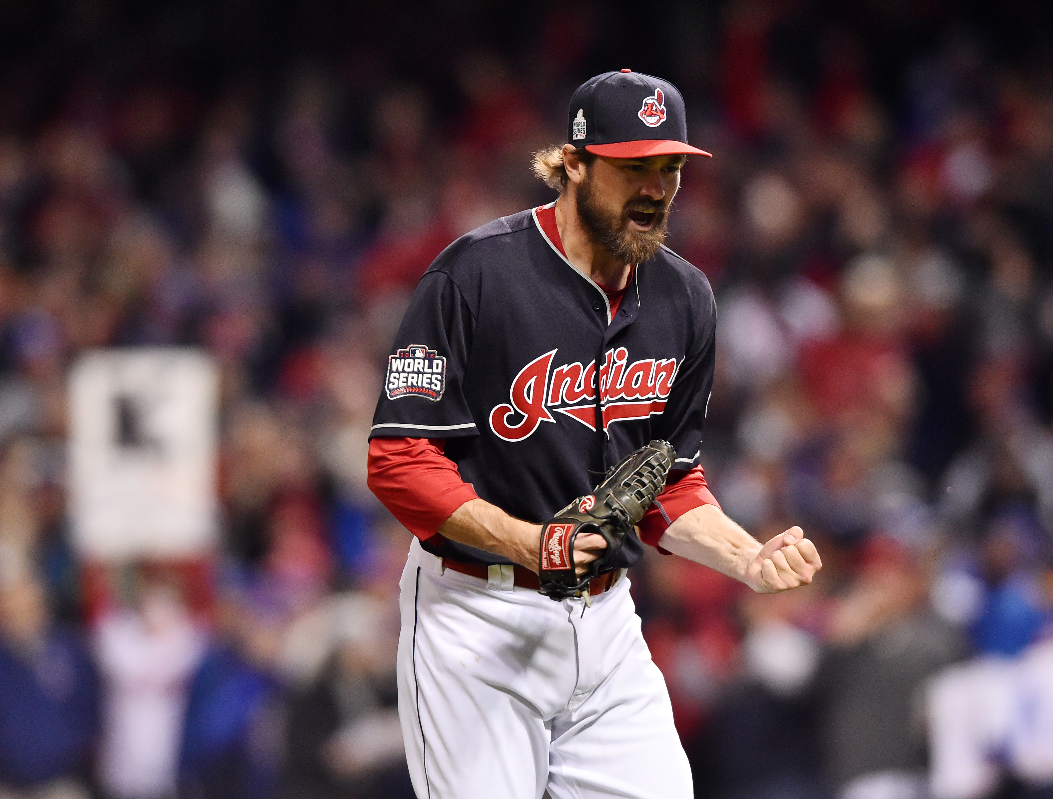 Oct 25, 2016; Cleveland, OH, USA; Cleveland Indians relief pitcher Andrew Miller reacts after striking out Chicago Cubs catcher David Ross (not pictured) to end the top of the 7th inning in game one of the 2016 World Series at Progressive Field. Ken Blaze-USA TODAY Sportsundefined
