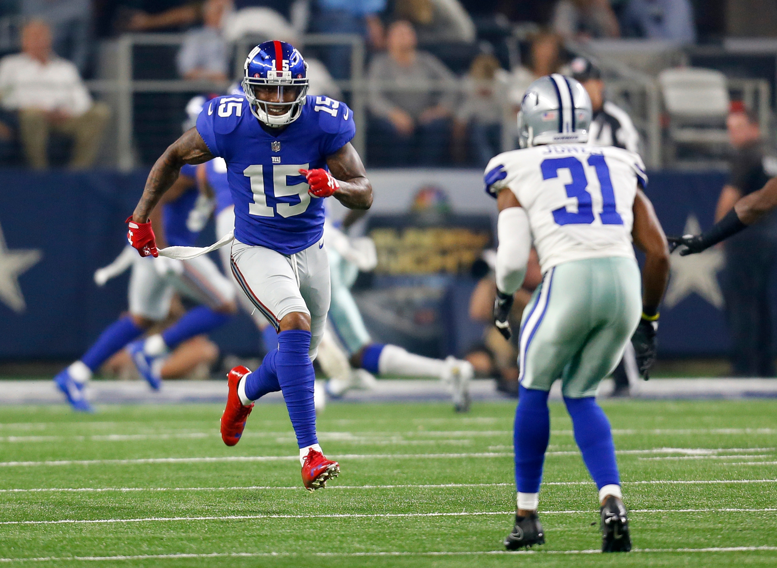New York Giants wide receiver Brandon Marshall (15) runs a route as Dallas Cowboys safety Byron Jones (31) defends during an NFL football game, Sunday, Sept. 10, 2017, in Arlington, Texas. (AP Photo/Roger Steinman) / Roger Steinman/AP
