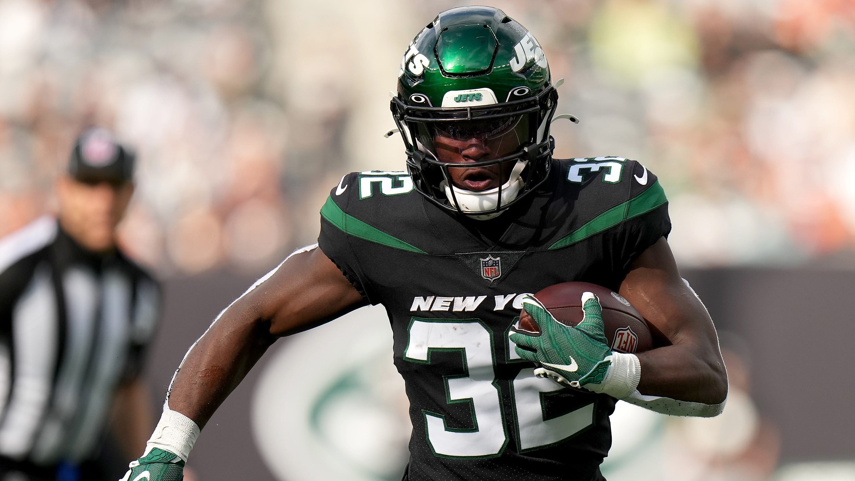 New York Jets running back Michael Carter (32) carries the ball on a touchdown run in the first quarter during a Week 8 NFL football game against the Cincinnati Bengals, Sunday, Oct. 31, 2021, at MetLife Stadium in East Rutherford, N.J. Cincinnati Bengals At New York Jets Oct 31 / Kareem Elgazzar / USA TODAY NETWORK