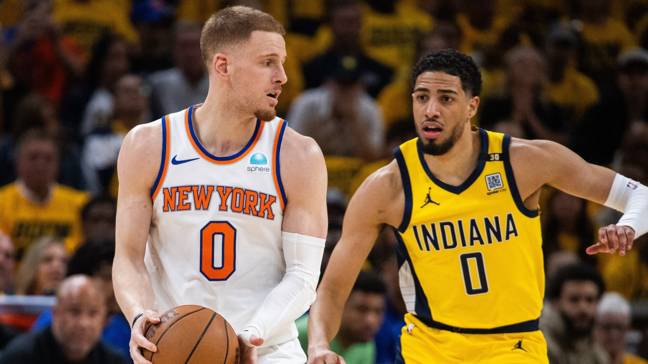 May 10, 2024; Indianapolis, Indiana, USA; New York Knicks guard Jalen Brunson (11) dribbles the ball while Indiana Pacers forward Aaron Nesmith (23) defends during game three of the second round for the 2024 NBA playoffs at Gainbridge Fieldhouse. / Trevor Ruszkowski-USA TODAY Sports