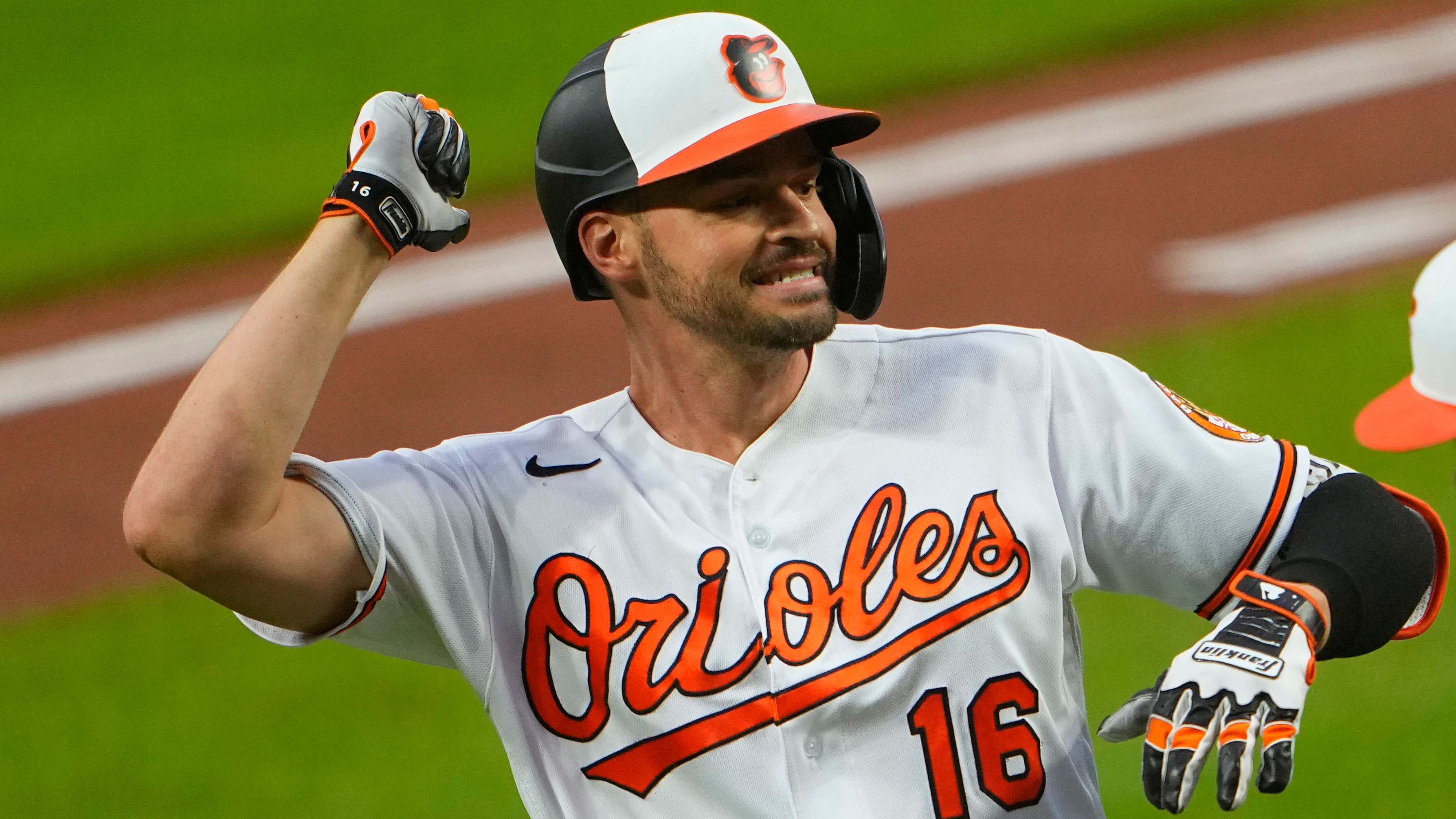 Jun 7, 2022; Baltimore, Maryland, USA; Baltimore Orioles designated hitter Trey Mancini (16) and right fielder Anthony Santander (25) bump arms to celebrate his home run against the Chicago Cubs during the first inning at Oriole Park at Camden Yards. / Gregory Fisher-USA TODAY Sports