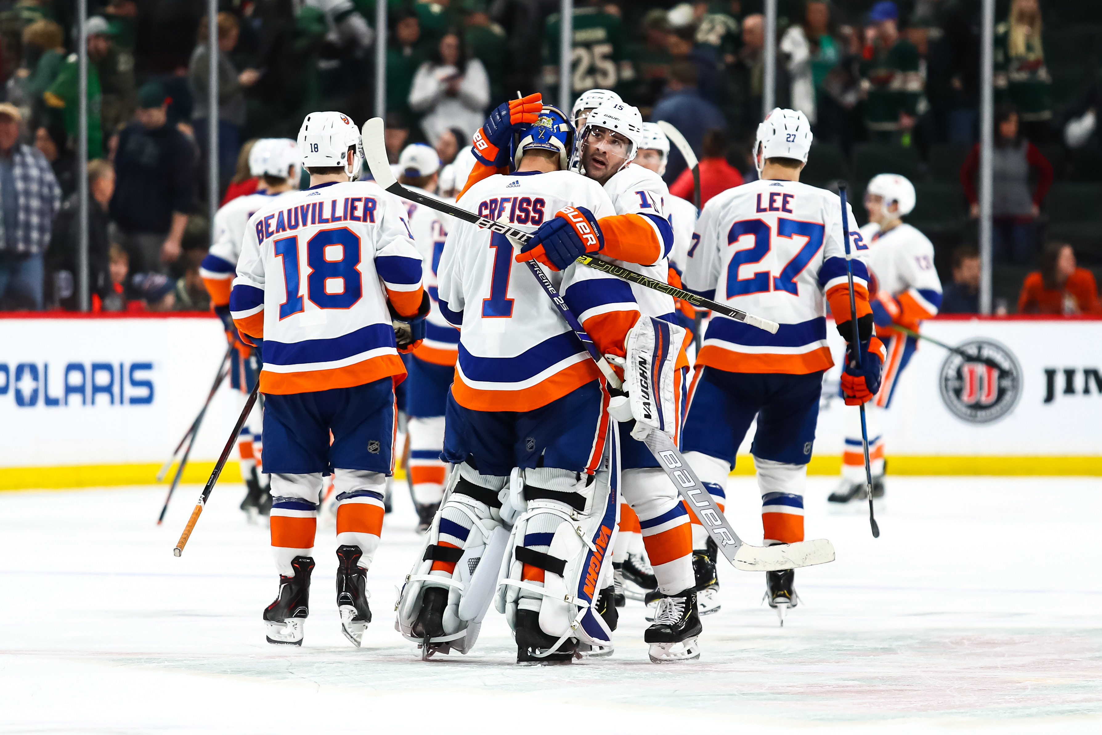 New York Islanders goaltender Thomas Greiss is congratulated by his teammates after the Islanders defeated the Minnesota Wild 3-2 in overtime at Xcel Energy Center. / David Berding/USA TODAY Sports