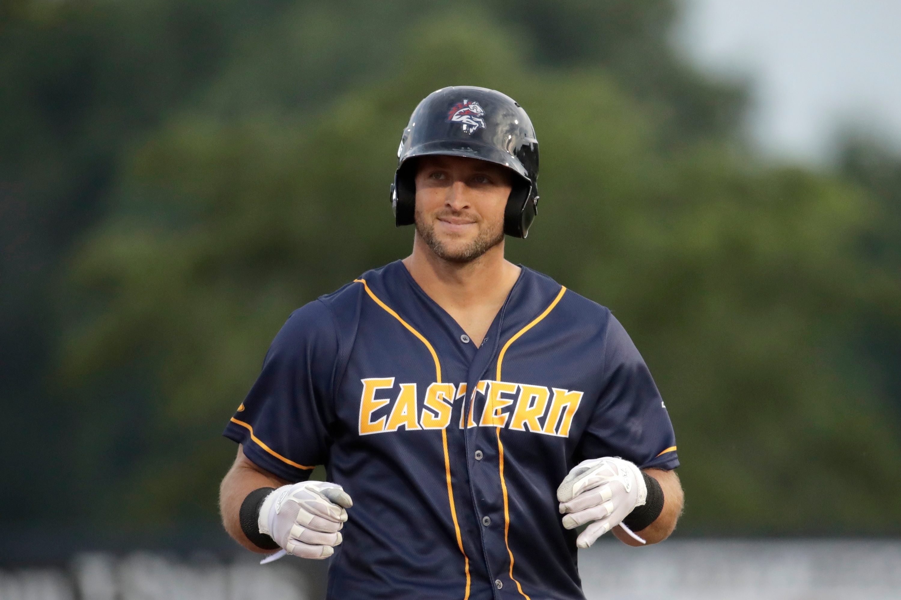 Eastern Division's Tim Tebow walks to talk to the third base coach during the second inning of the Eastern League All-Star minor league baseball game, Wednesday, July 11, 2018, in Trenton, N.J. (AP Photo/Julio Cortez) / Julio Cortez/AP
